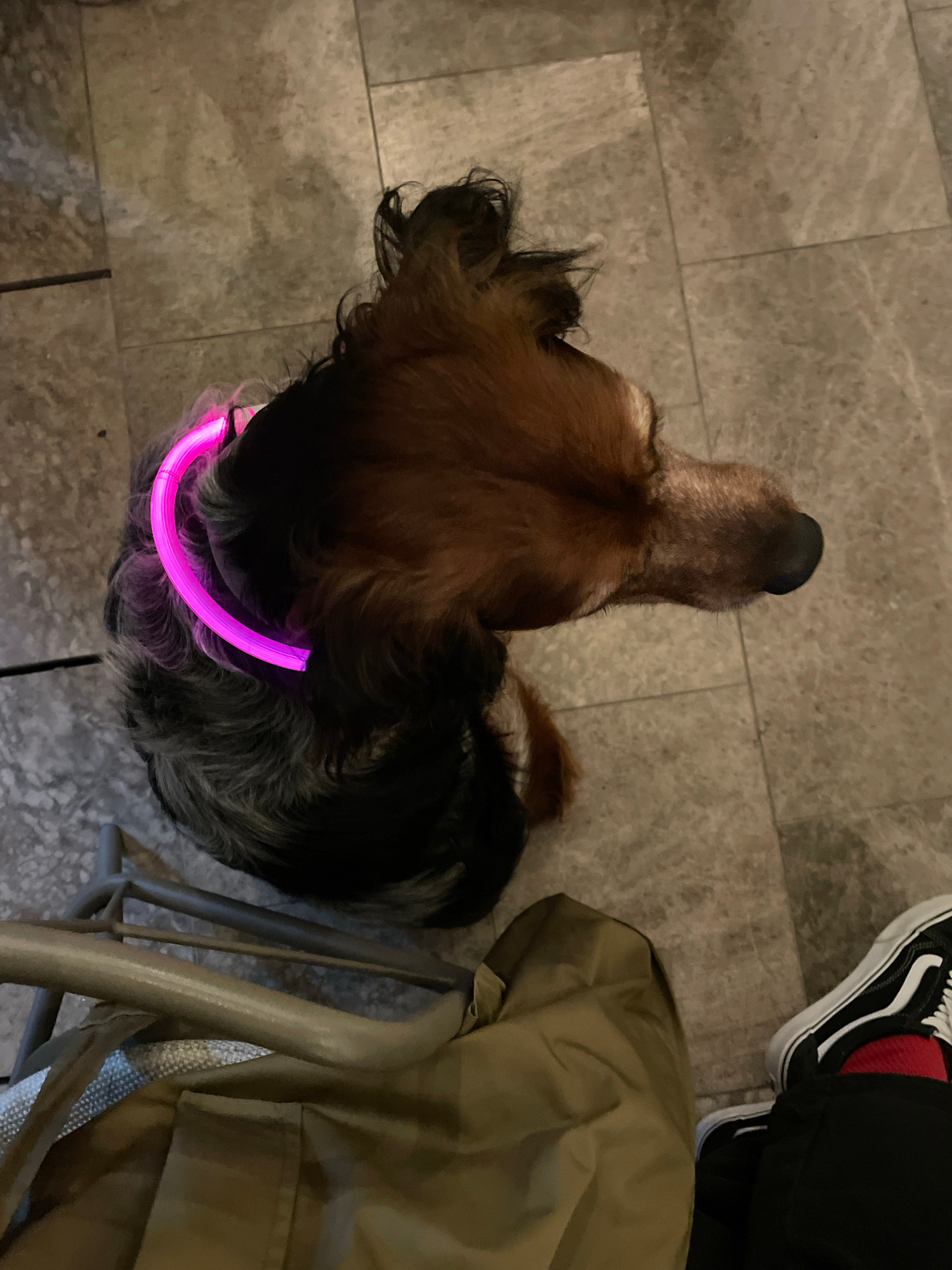 The image shows a dog from an overhead perspective. The dog has brown and black fur and is wearing a glowing pink collar. The dog is on a tiled floor. In the upper right corner, a person's leg is visi…read more