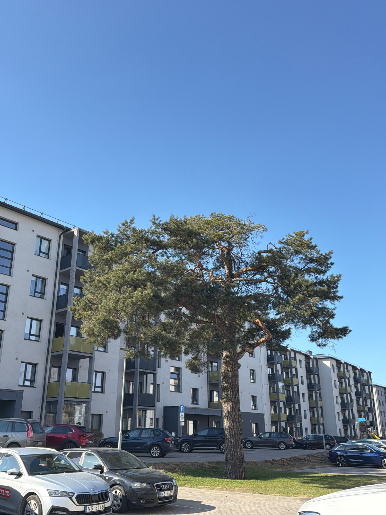 The image shows a tall evergreen tree with a thick trunk, situated in front of a multi-story apartment building with light gray walls and dark-framed windows. The sky is a clear, cloudless blue. A row…read more