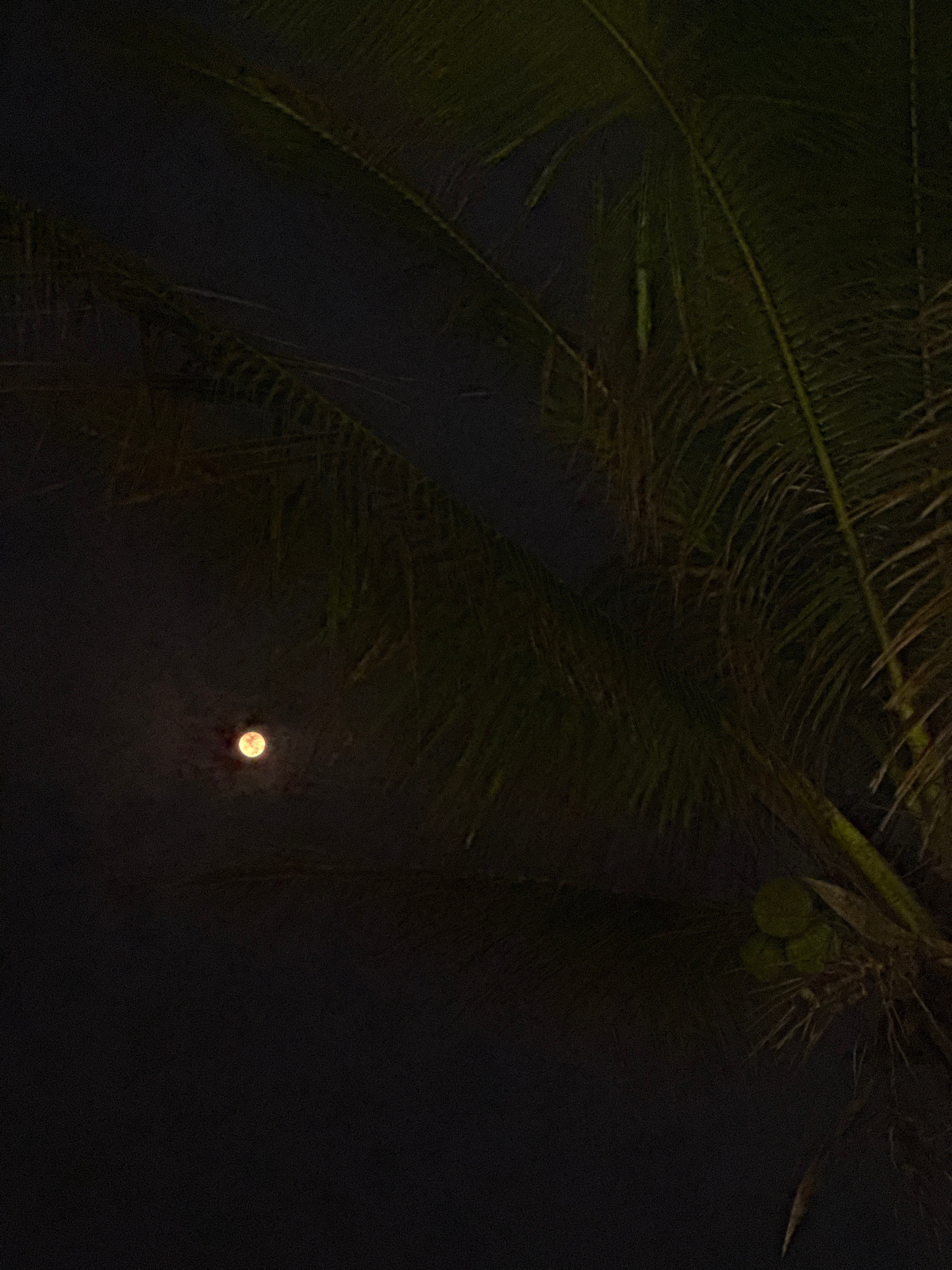 The image shows a night scene in Đà Nẵng, Vietnam, taken from below a palm tree. The fronds of the tree are visible at the top and left of the frame. A cluster of coconuts is visible at the top right.…read more