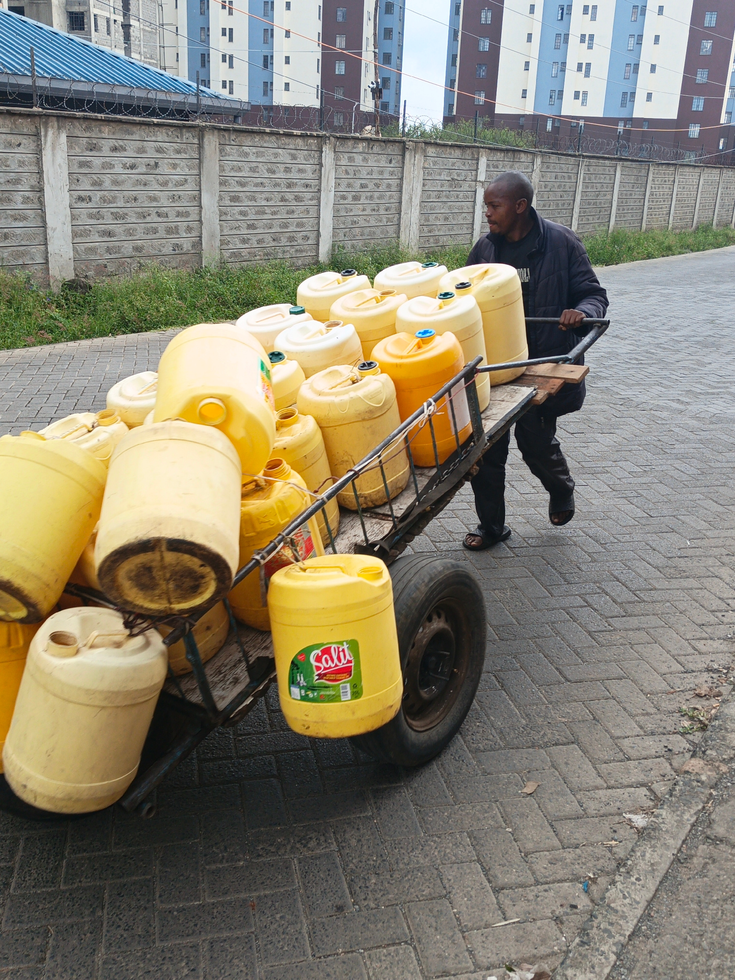 A man pulls a heavily loaded cart filled with yellow plastic containers along a brick-paved road in Nairobi, Kenya. The containers appear to be full of liquid, possibly water. The cart has one visible…read more