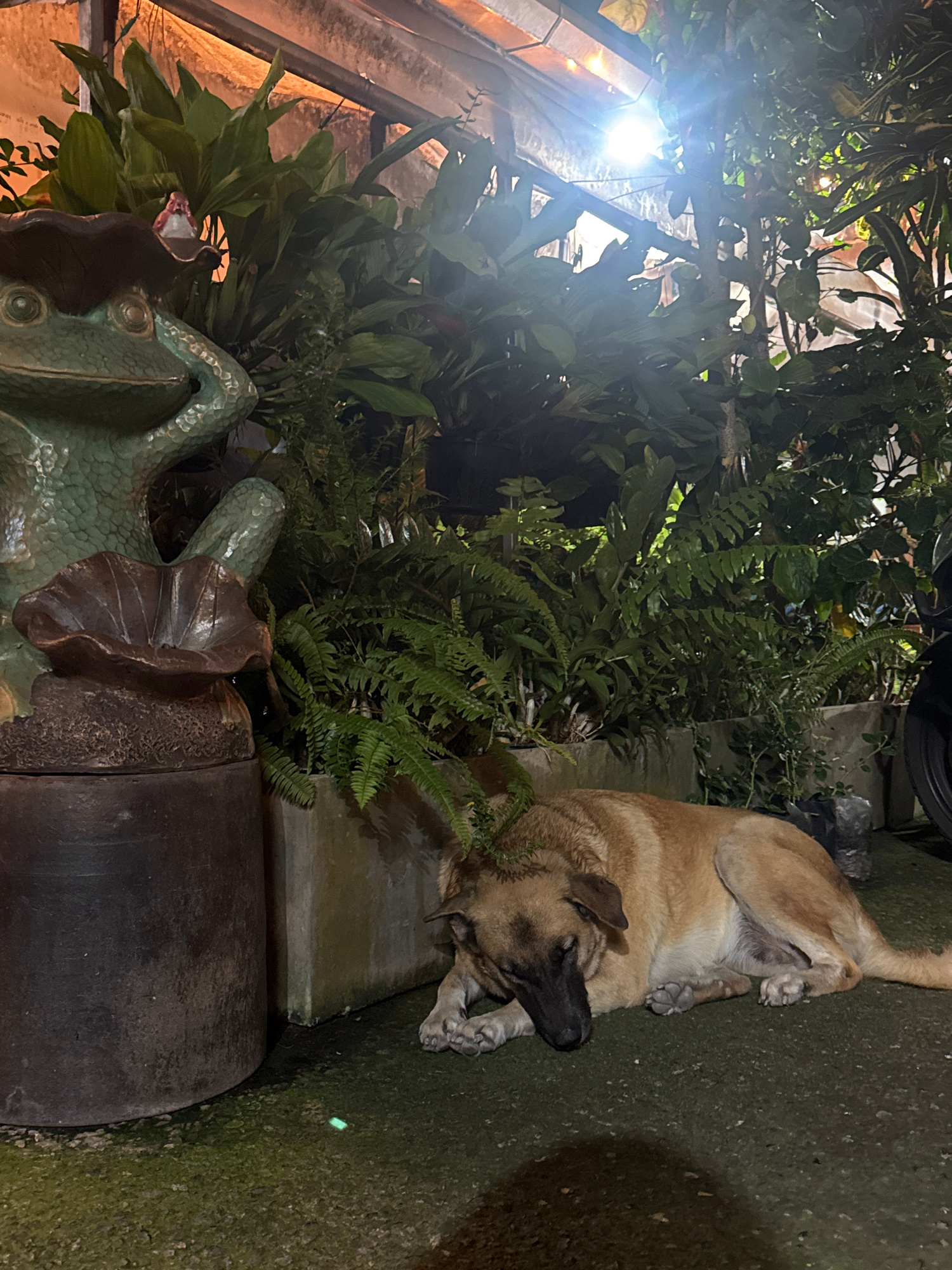 This image captures a nocturnal outdoor scene, likely in Patong, Thailand, illuminated by artificial light. The central subject is a medium-sized dog with light brown fur and a dark muzzle, lying peac…read more