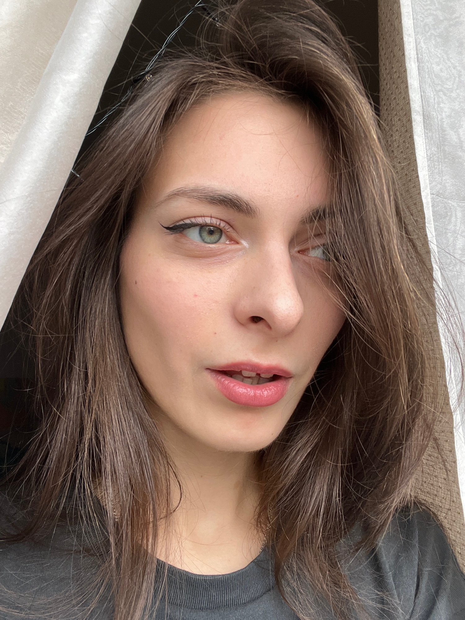 A young woman with brown hair and green eyes is depicted in a close-up, slightly tilted selfie. She has fair skin and is wearing subtle makeup, including eyeliner and pink lipstick. Her hair is styled…read more