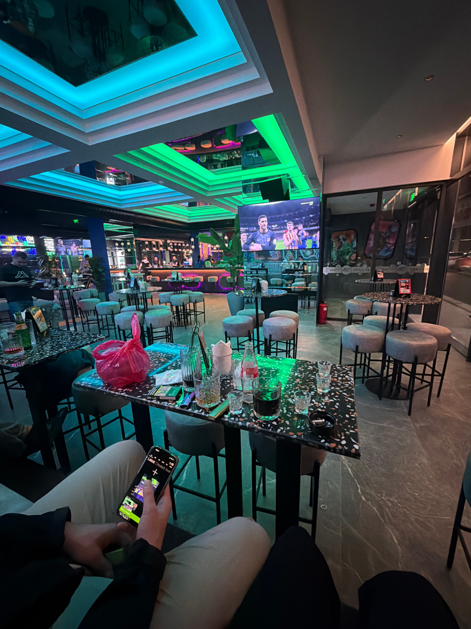 A tilted, long-exposure photograph shows the interior of a bar or restaurant, likely in Varna, Bulgaria given the information provided. A person sits at a table with a distinctive terrazzo-like top, h…read more
