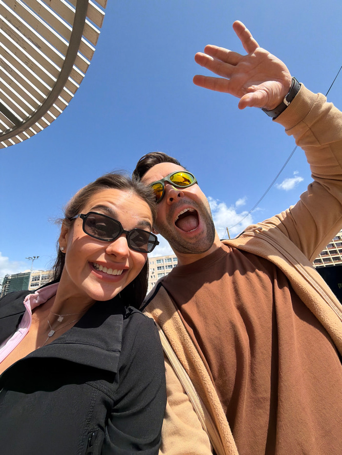 A low-angle outdoor selfie depicts two individuals, a female and a male, under a clear blue sky with sparse white clouds. The female, on the left, wears black rectangular sunglasses, a black jacket ov…read more