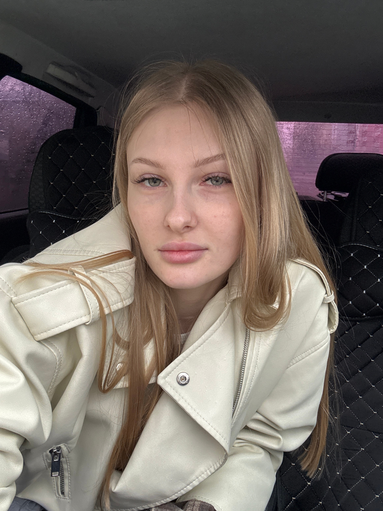 A young woman with long, straight blonde hair and light-colored eyes is captured in a close-up portrait, rotated 90 degrees counter-clockwise. She has a fair complexion with faint freckles and her lip…read more