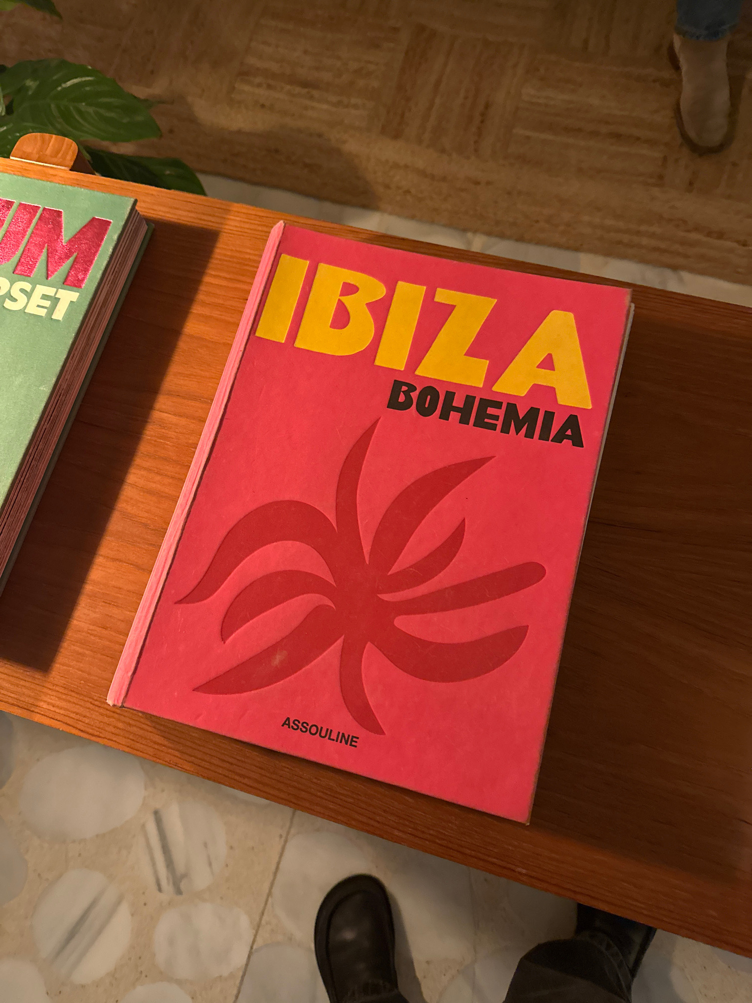 A top-down shot shows a coffee table with a book titled "Ibiza Bohemia" by Assouline prominently displayed. The book has a red cover and a large abstract floral design in red. "IBIZA" is written verti…read more