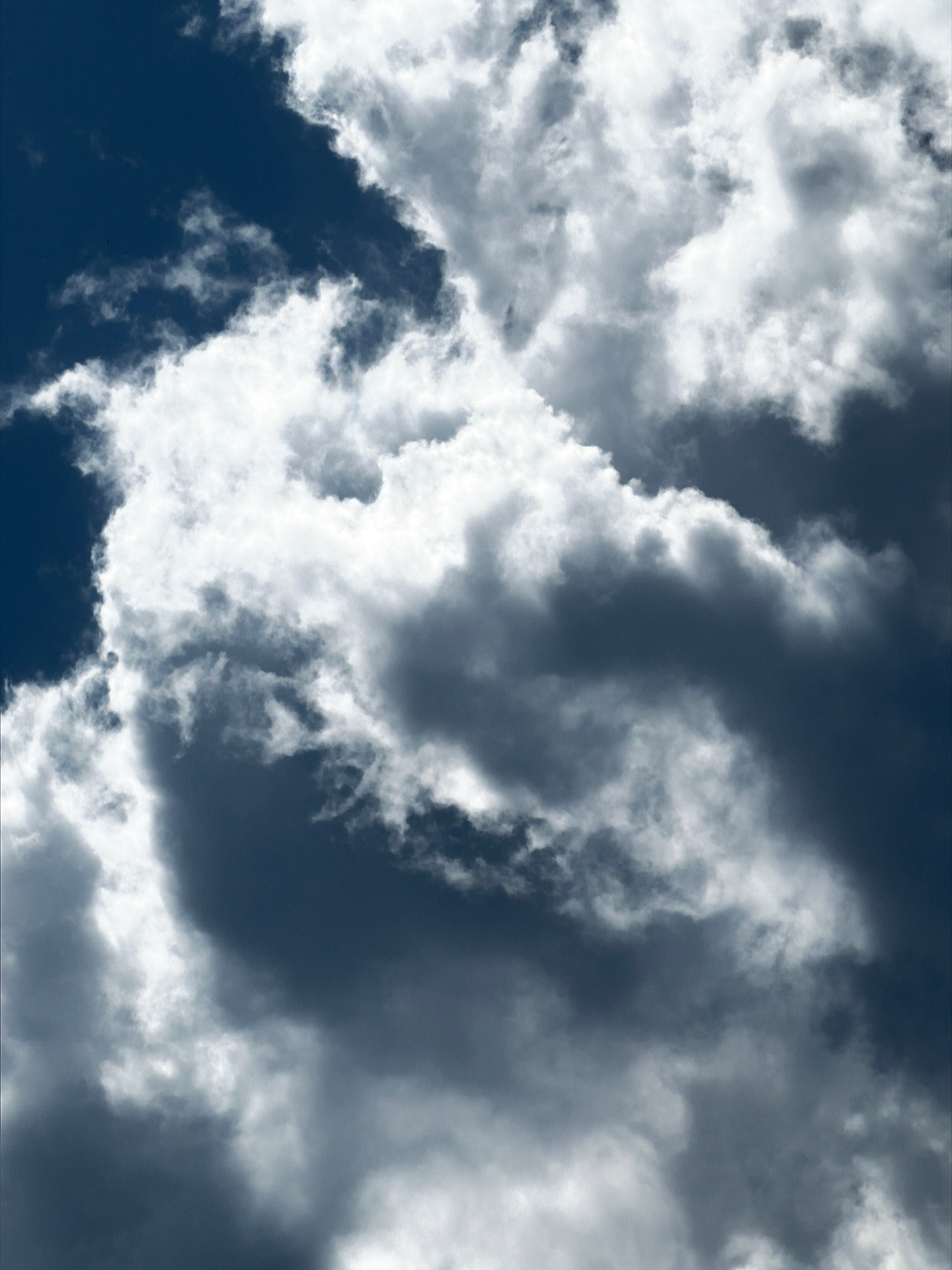 The image shows a sky filled with dark, billowing storm clouds, interspersed with patches of bright white clouds. The color of the sky is a deep blue. The overall impression is that of an approaching…read more
