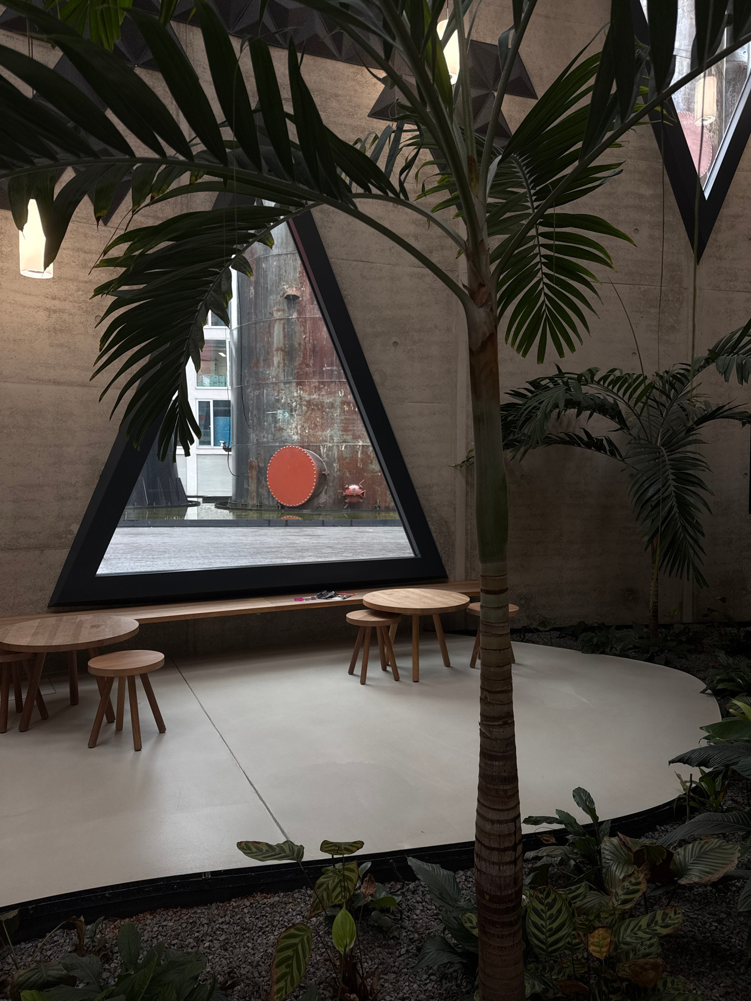 This image depicts a contemporary indoor space situated in the Belval district of Esch-sur-Alzette, Luxembourg. The interior features raw, light grey concrete walls and ceiling, contrasting with integ…read more