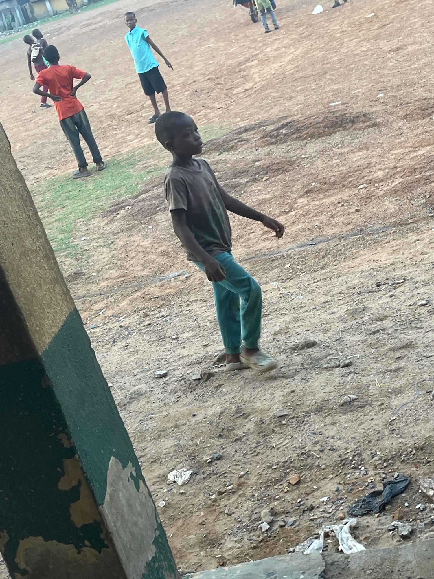 The image shows a dusty field on the outskirts of Akwanga, Nigeria. In the foreground is a green painted concrete barrier, likely a wall or the edge of a building. On the field, there are several youn…read more