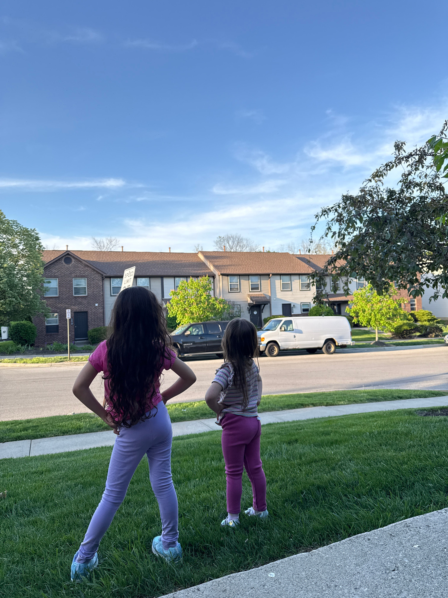 The image captures a residential street scene in bright daylight. Two young girls, viewed from behind, stand on a patch of green grass next to a concrete curb, looking towards the street and houses. T…read more