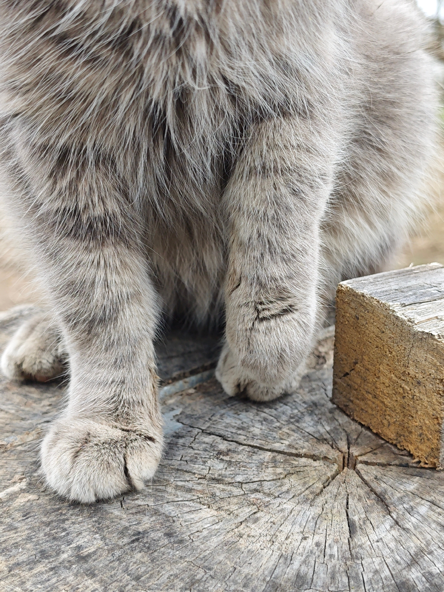 A close-up captures the paws of a furry, grey cat, possibly a domestic longhair breed. The cat's paws rest on a weathered, circular wooden surface, likely a tree stump. A rectangular piece of wood sit…read more