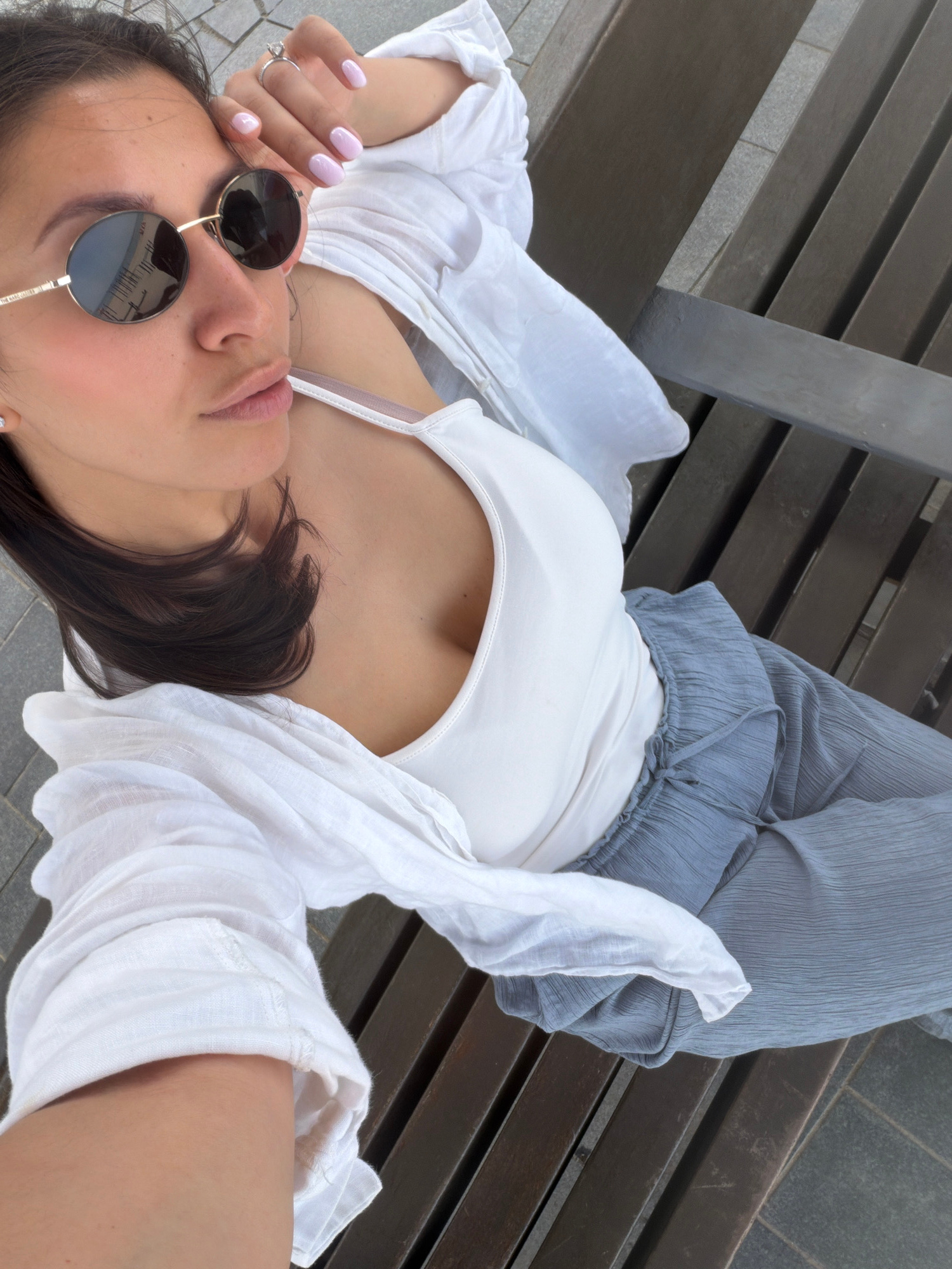 A woman is lying on a bench in what appears to be a public space. She is wearing sunglasses, a white top, a white open-front shirt, and light blue pants. The bench has wooden slats and a concrete base…read more