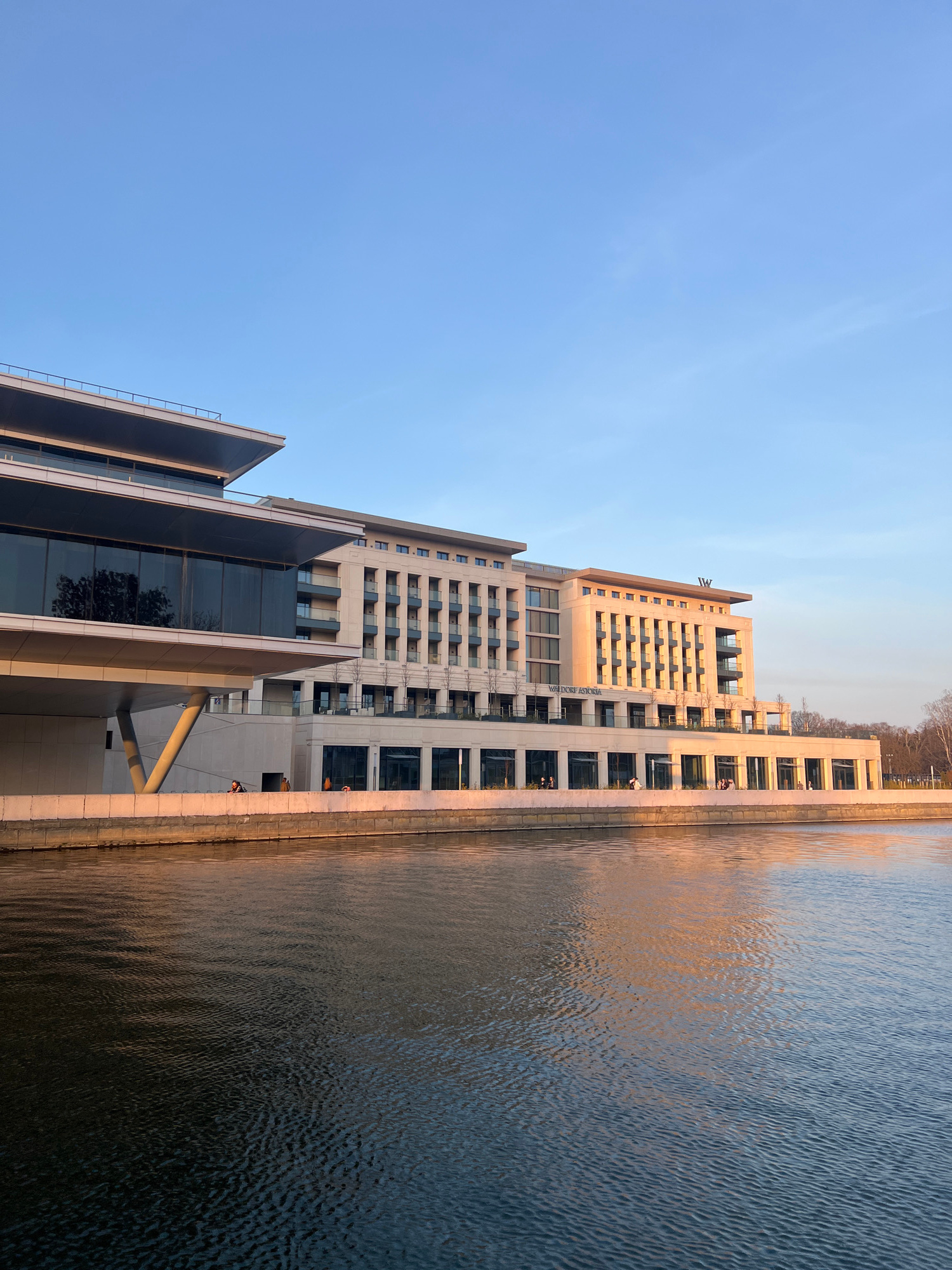 The image captures a modern architectural scene in Minsk, Belarus. The photograph is angled to show both the sky and the water body alongside a cluster of modern buildings. The dominant structure is a…read more