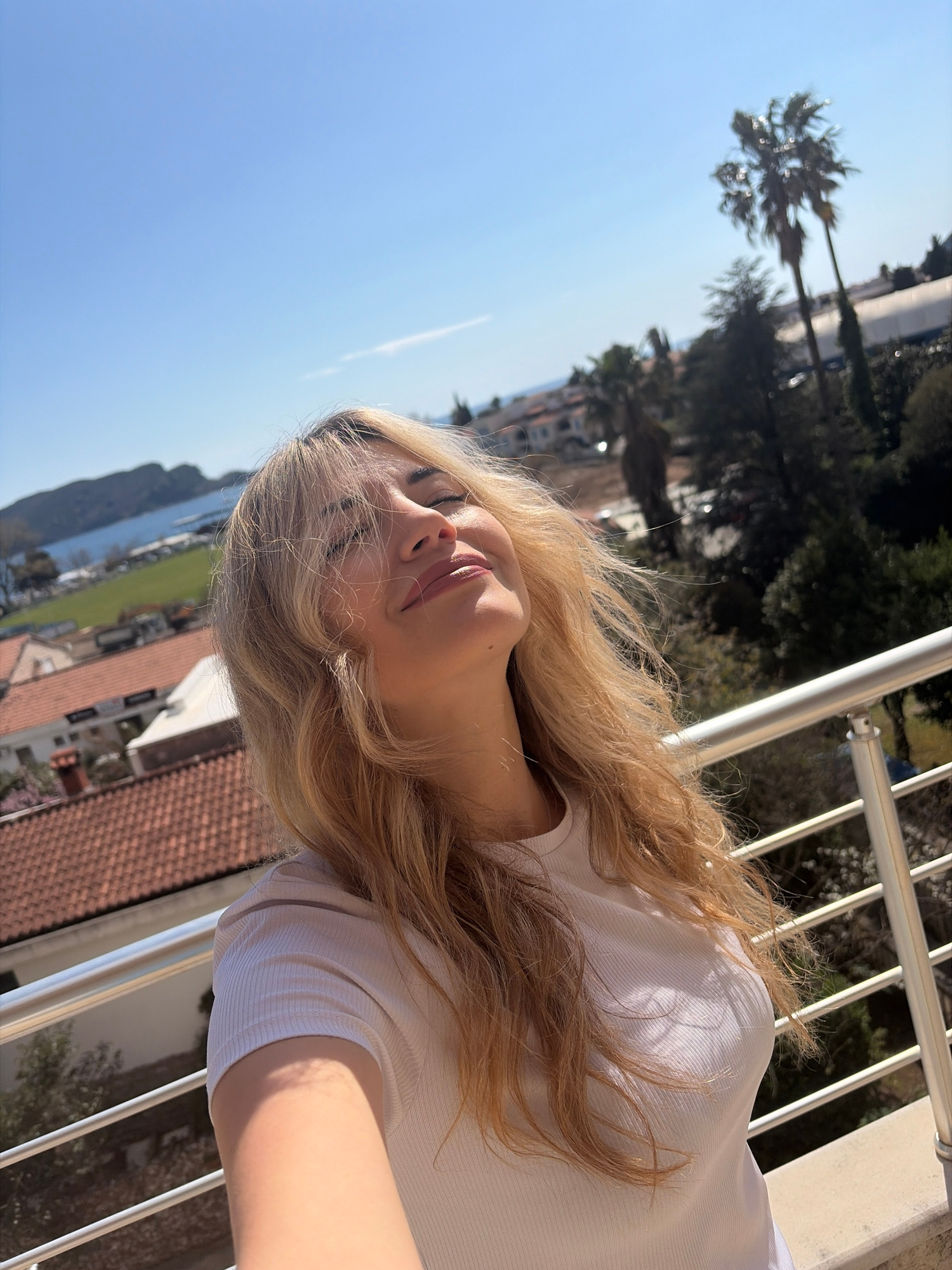 A woman with long blonde hair leans back against a white metal railing, with a view of Budva, Montenegro, in the background. The blue sky is visible above, and a palm tree is seen on the left side of…read more