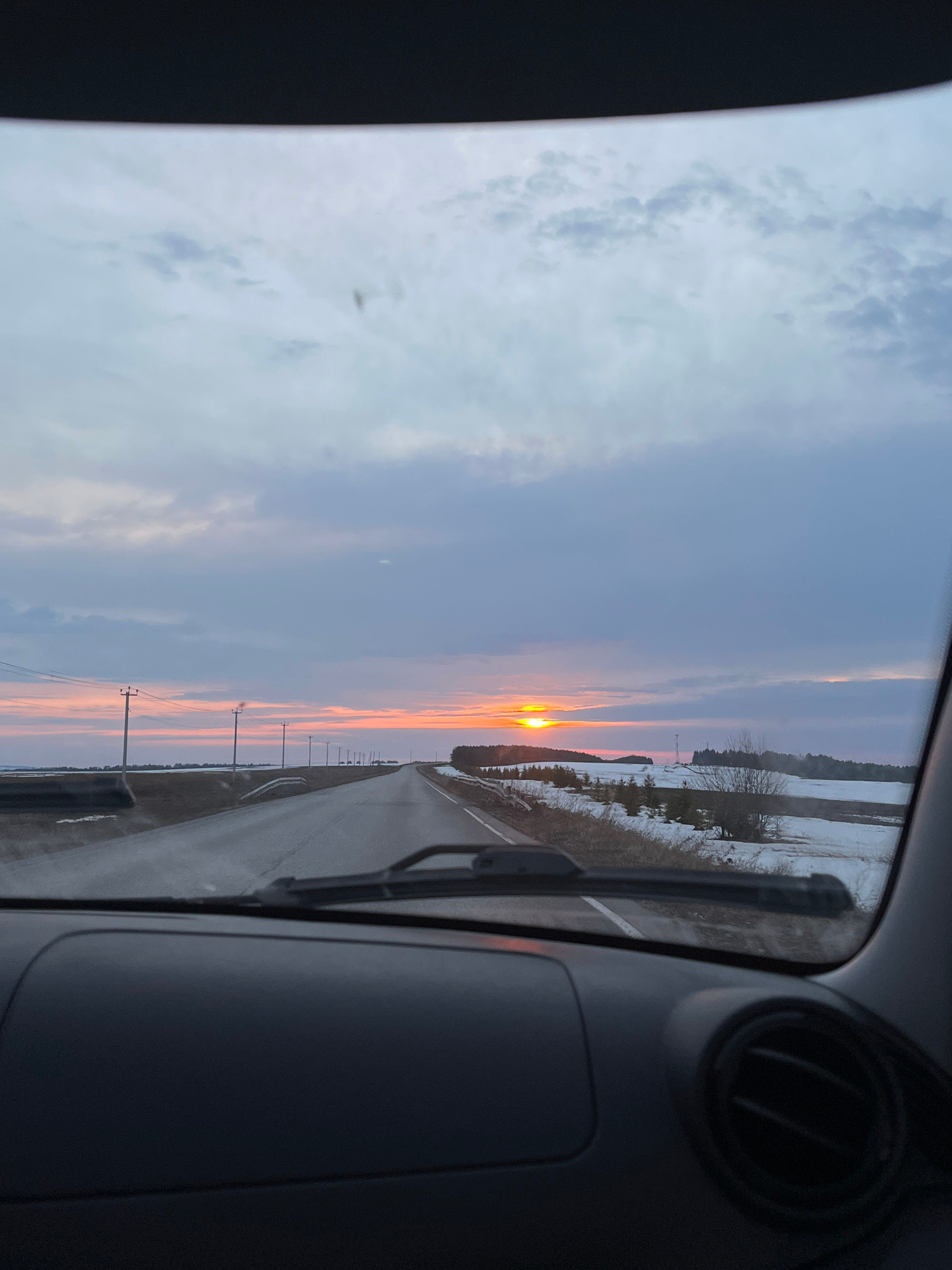The image is taken from inside a vehicle, looking out the front windshield. It is daytime. The sun is setting, visible down a long, straight road. The road is flanked by what appears to be snowy or icβ¦read more