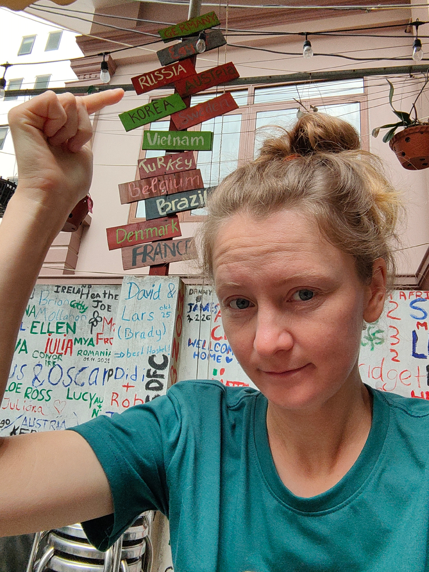 A woman with blonde hair in a messy bun and wearing a teal t-shirt is taking a selfie in Bai Chay Ward, Vietnam. She is pointing her finger towards a signpost with country names, including Germany, Ru…read more