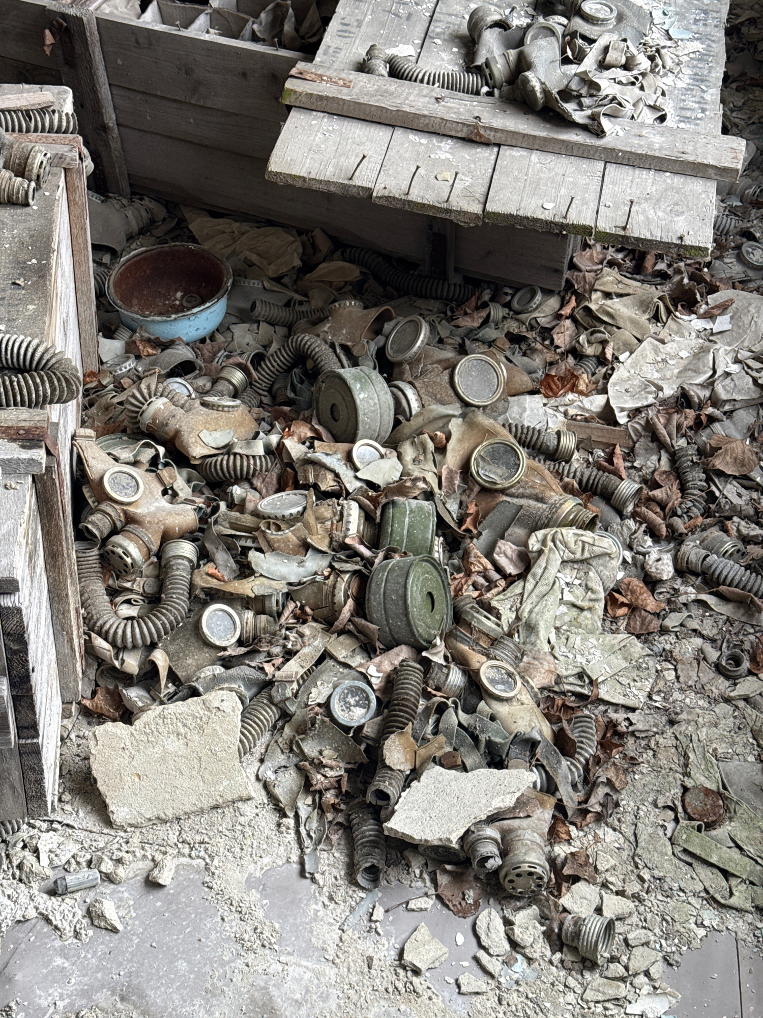 The image depicts a debris field of discarded gas masks and associated equipment inside a building in Prypiat, Ukraine. A partially collapsed wooden structure is visible to the left. The masks are of…read more