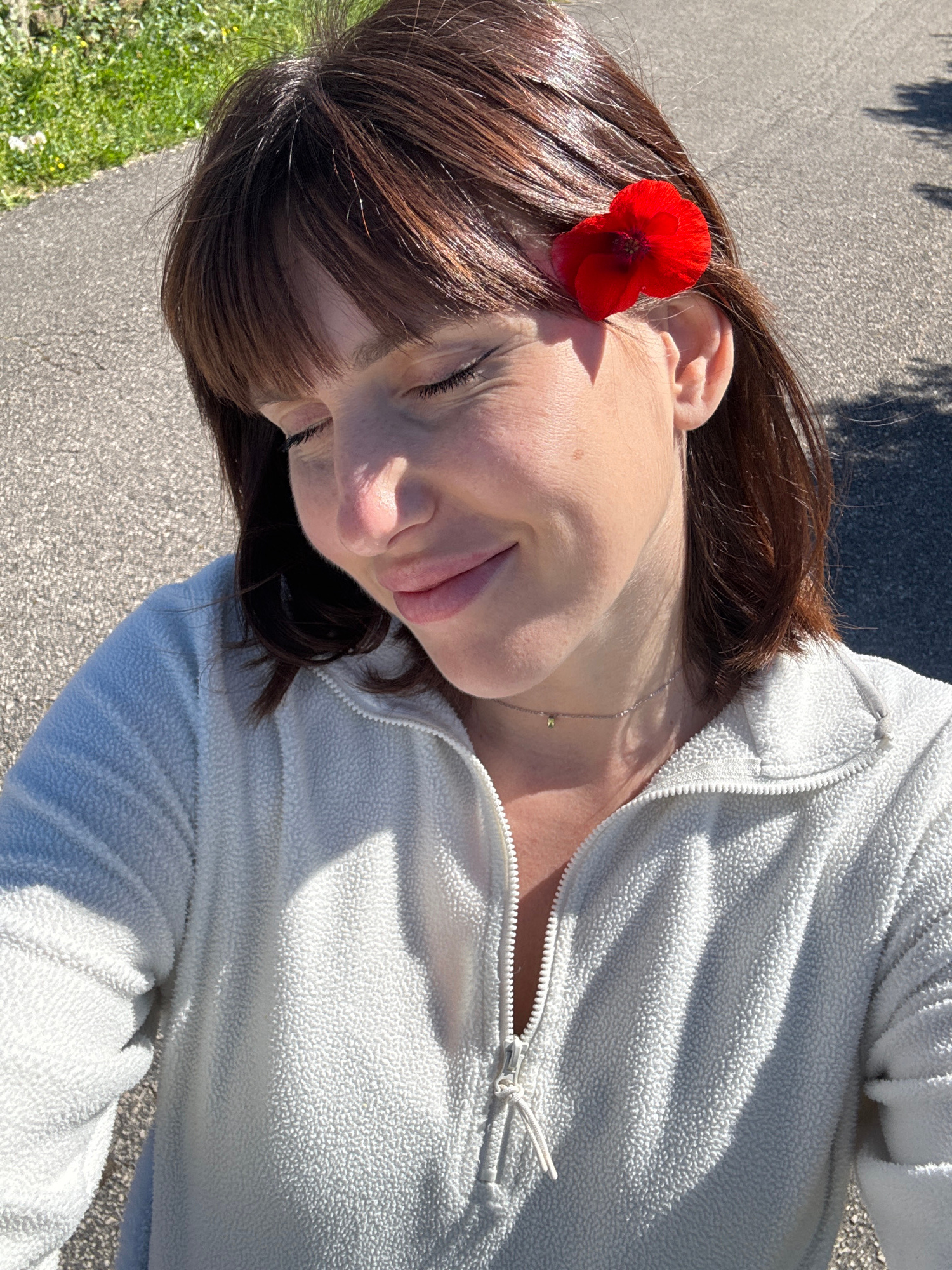 The image shows a woman with brown hair and fair skin, wearing a white fleece jacket. A red poppy flower is placed in her hair, near her ear. She is seen outdoors, with asphalt ground visible in the b…read more