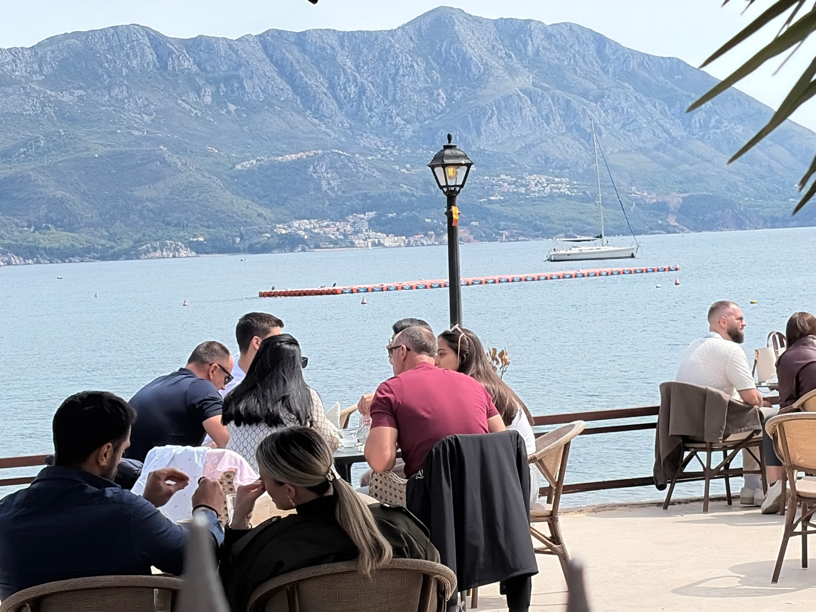 The image depicts a scene in Budva, Montenegro. A group of people are seated at outdoor tables on a patio, presumably at a restaurant. There are at least two tables occupied. The background features a…read more