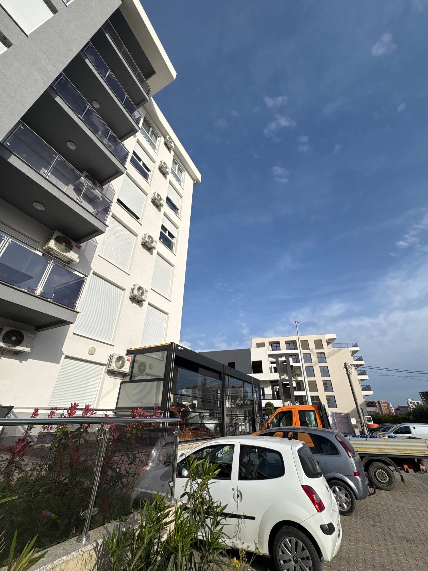 The image shows an outdoor scene in Bar, Montenegro. It is taken from a low-angle perspective, looking up at a building with white walls, dark grey balconies, and numerous air conditioning units mount…read more