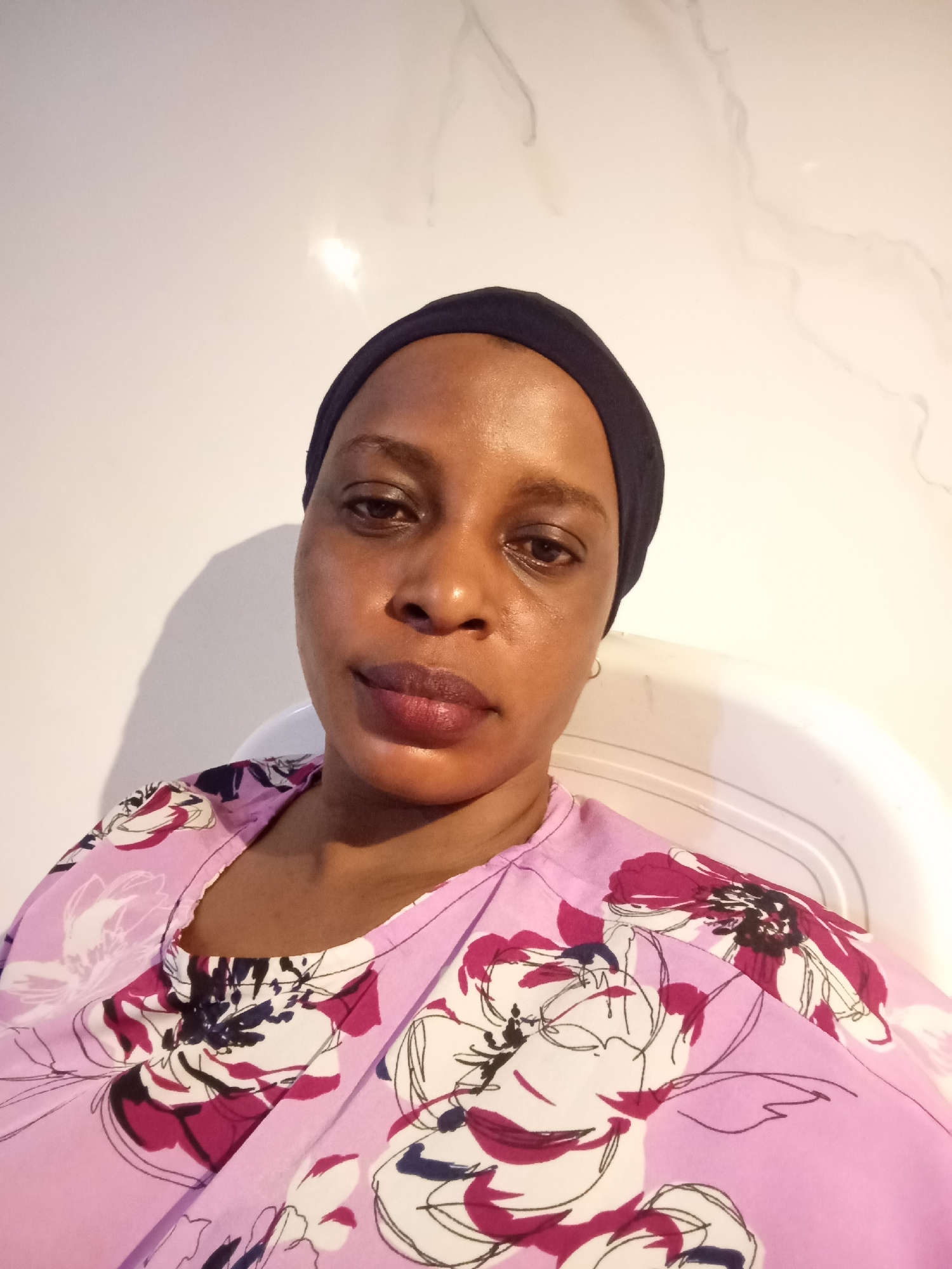 A woman is centered in the frame, wearing a dark head covering and a light purple floral print top. Her skin appears moist and reflects light. She has dark eyes and full lips with what appears to be a…read more