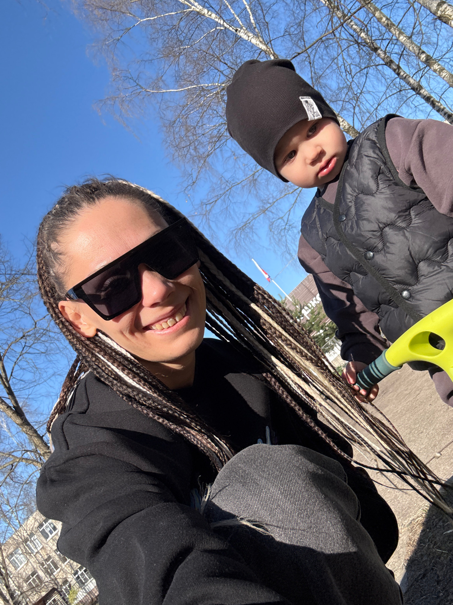 A rotated eye-level medium shot depicts a smiling woman in sunglasses and braided hair facing the camera, along with a young child wearing a black beanie and vest. The woman is dressed in black clothi…read more