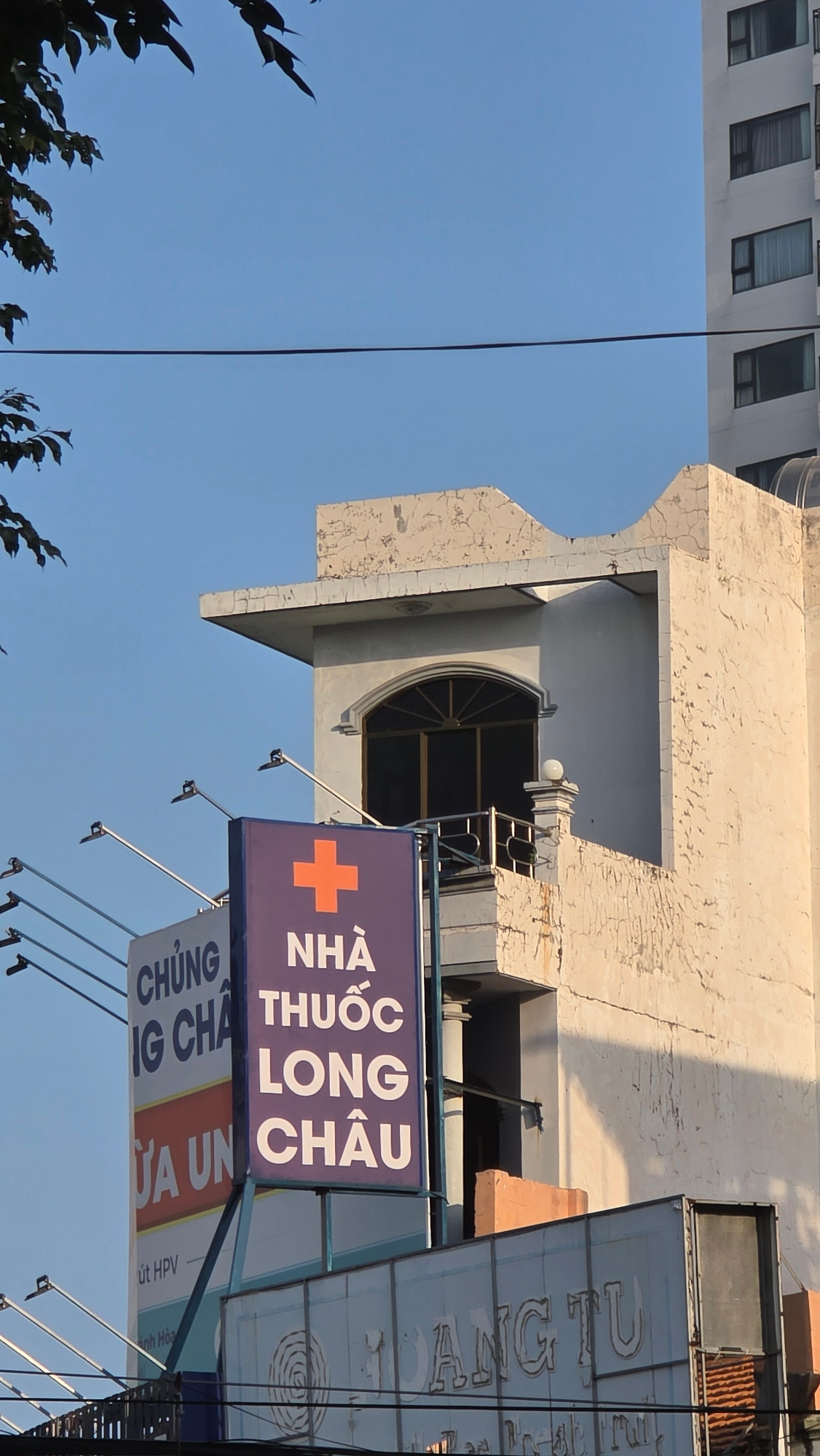The image is a photograph taken from a low angle, capturing the exterior of a building in what appears to be Nha Trang, Vietnam. Dominating the frame is a blue sign with the text "NHÀ THUỐC LONG CHÂU"…read more