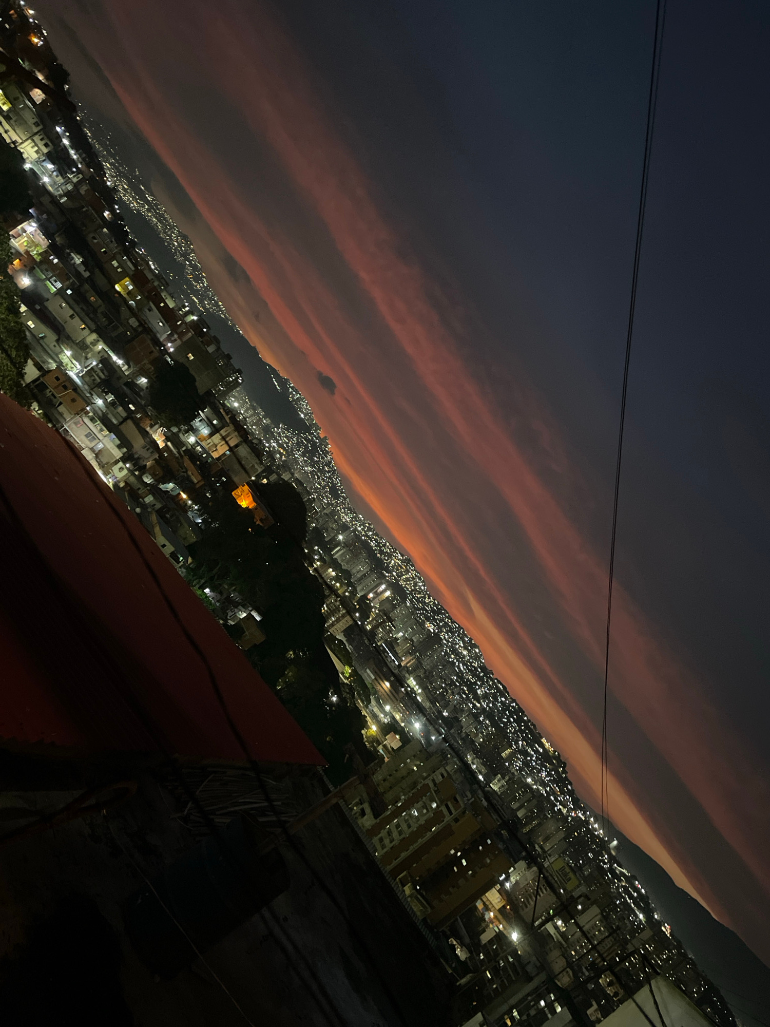 The image captures a nighttime view of Caracas, Venezuela, with a dramatic sky featuring long, reddish-pink clouds streaking across the upper portion of the frame. Below, a dense urban landscape unfol…read more