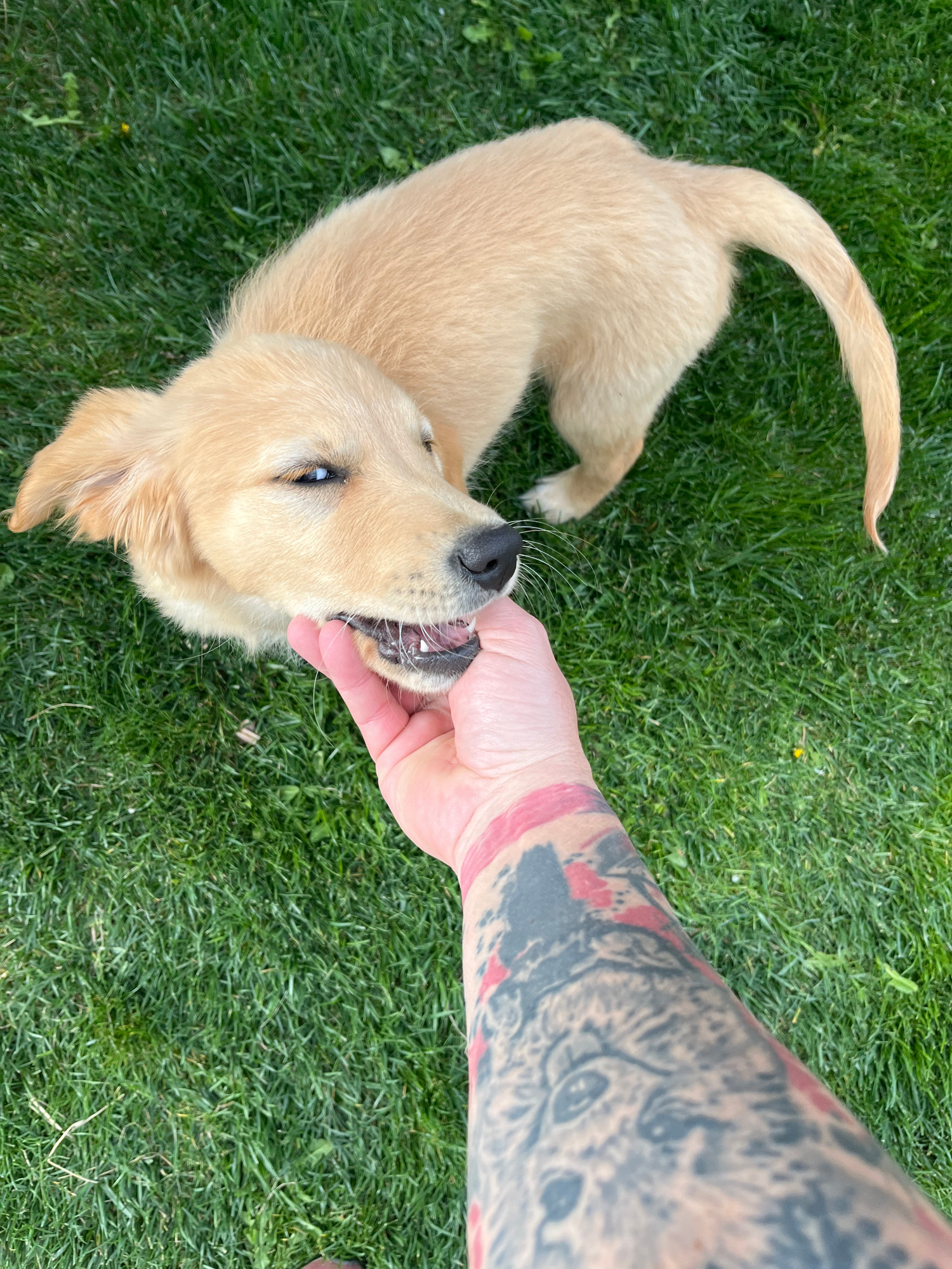 A golden retriever puppy is on green grass, playing with a person whose arm is heavily tattooed. The location is not discernable from the image.
