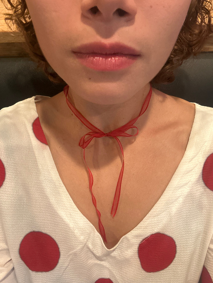 A close-up, slightly angled shot shows a person's face and upper torso. Prominent features include full, glossy lips, nose, and curly hair. A red ribbon is tied around the neck, resembling a delicate…read more