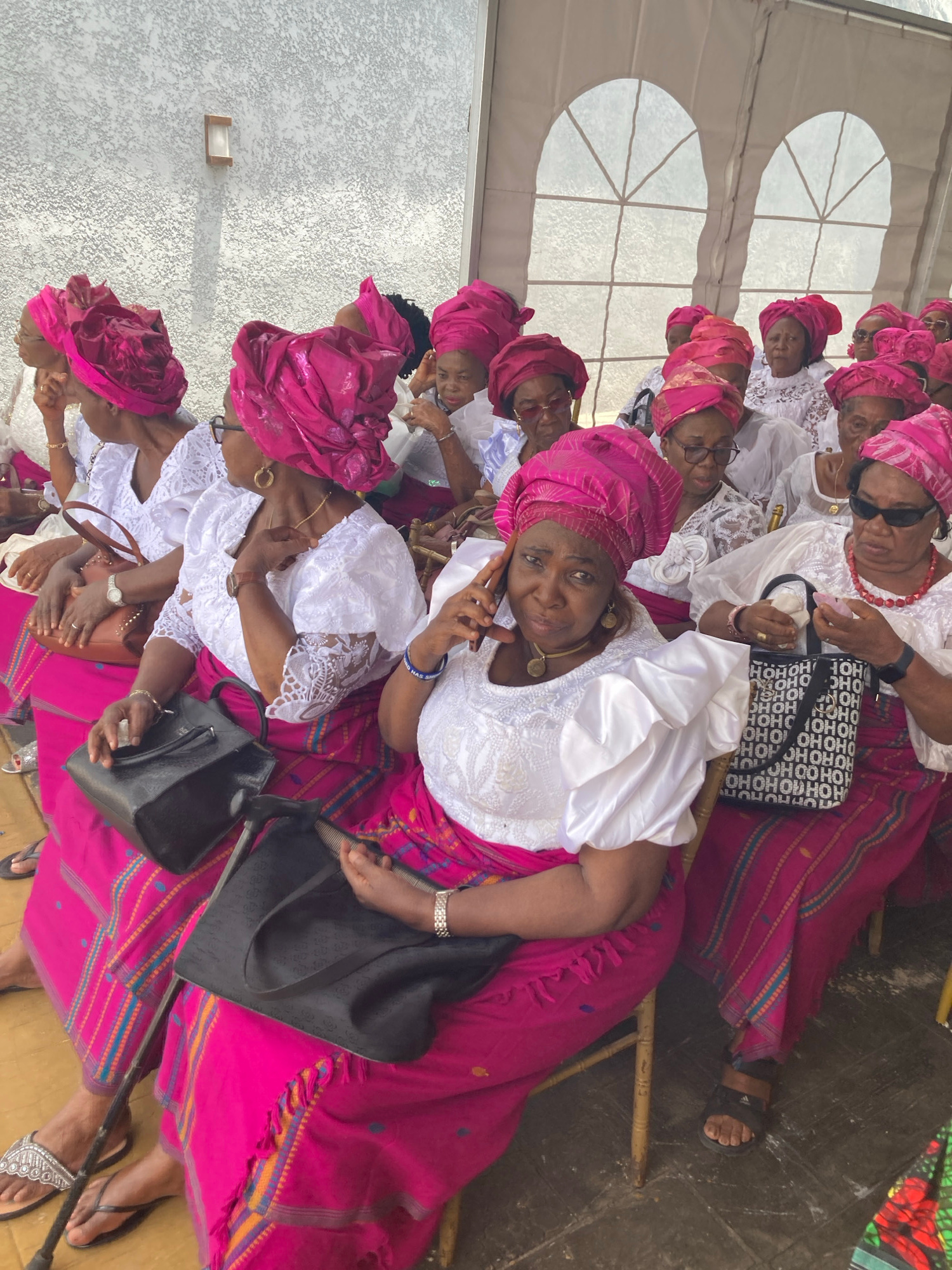 A group of women are seated together in what appears to be a tent or covered space. They are uniformly dressed with pink headwraps and white tops with pink skirts. Many are wearing jewelry, including…read more
