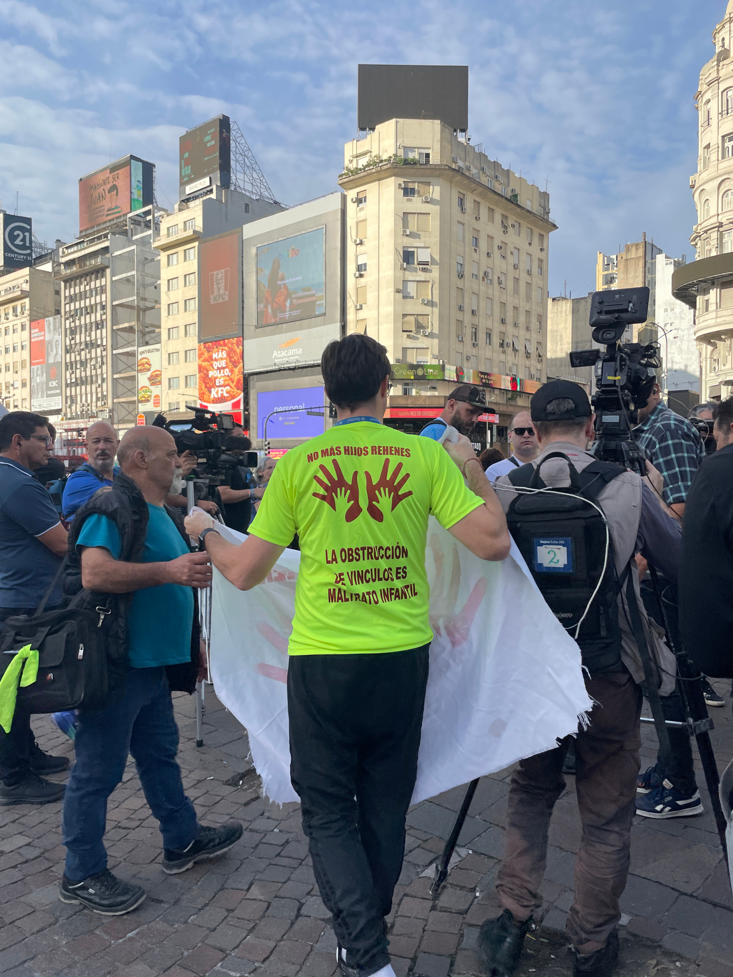 The image captures a protest in a bustling urban area, likely Buenos Aires, Argentina, indicated by the architectural style and billboards. A group of individuals are gathered on a paved street, with…read more
