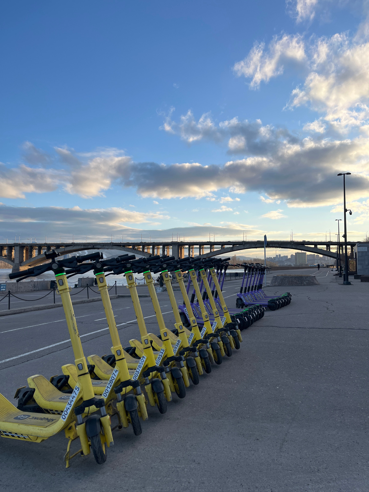 The image, taken in Krasnoyarsk, Russia, captures a serene urban scene during what appears to be the golden hour, either late afternoon or early evening. The sky is partly cloudy, with white and grey…read more