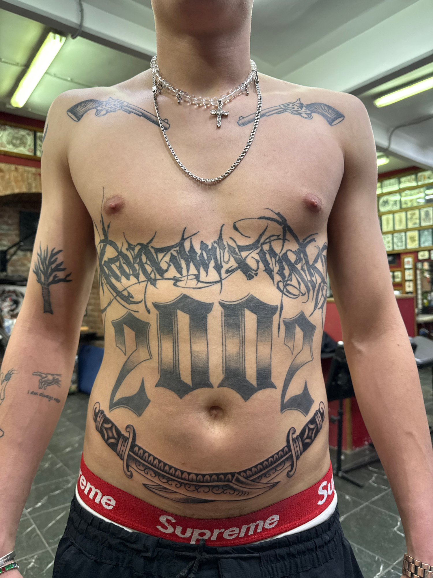 A person with numerous tattoos is depicted from the chest up. The tattoos include: two revolvers on either side of the chest; calligraphic designs with geometric shapes on the torso; a large design on…read more