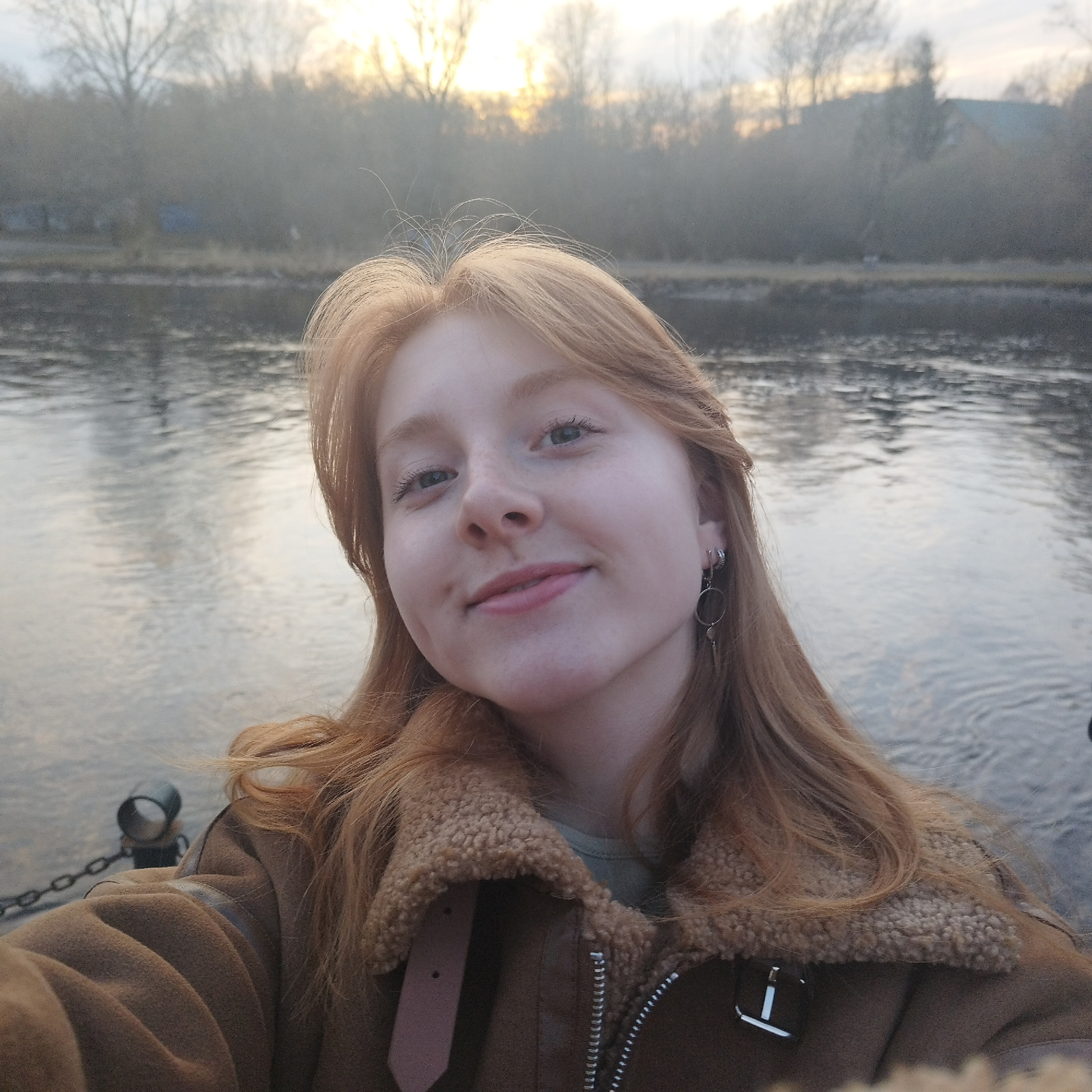 A selfie of a fair-skinned woman with reddish-blonde hair. The location appears to be a riverbank at sunset, potentially in Yekaterinburg, Russia. The woman wears a brown jacket with a shearling colla…read more
