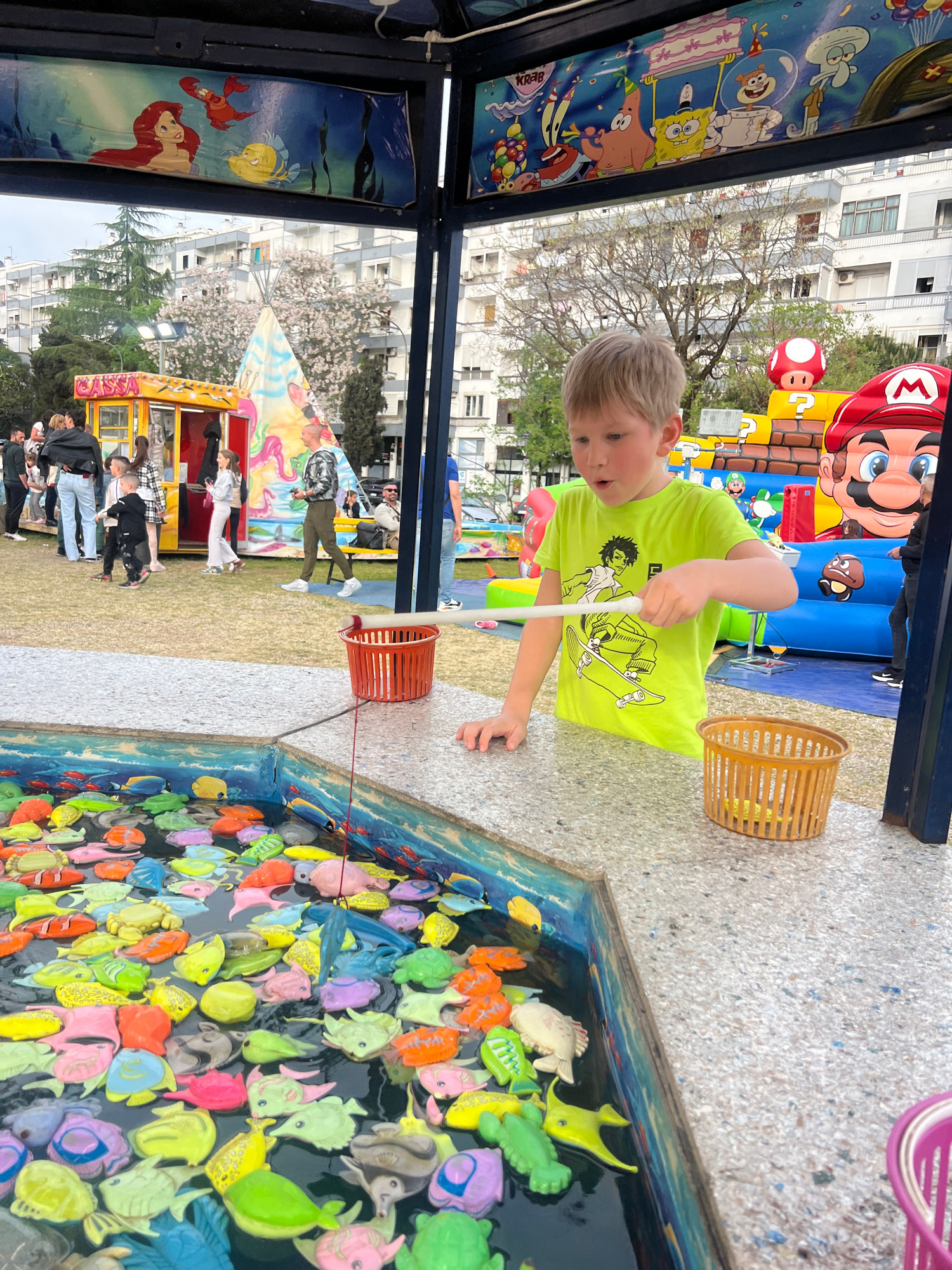 A boy wearing a green T-shirt is playing a fishing game at a carnival in Podgorica, Montenegro. The game involves using a fishing rod to catch colorful plastic fish from a small pool. Two people and t…read more