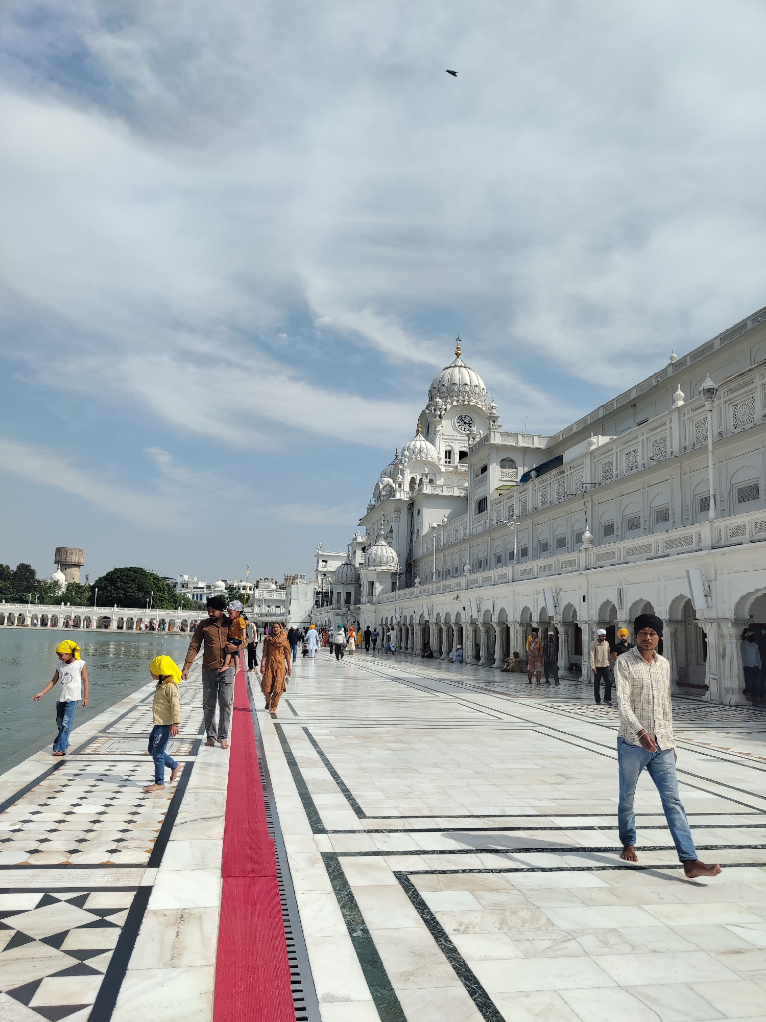 The image depicts a scene at the Golden Temple in Amritsar, India. The main focus is on the white marble pathway surrounding the holy pool (Sarovar). Along the pathway, several people are walking, som…read more