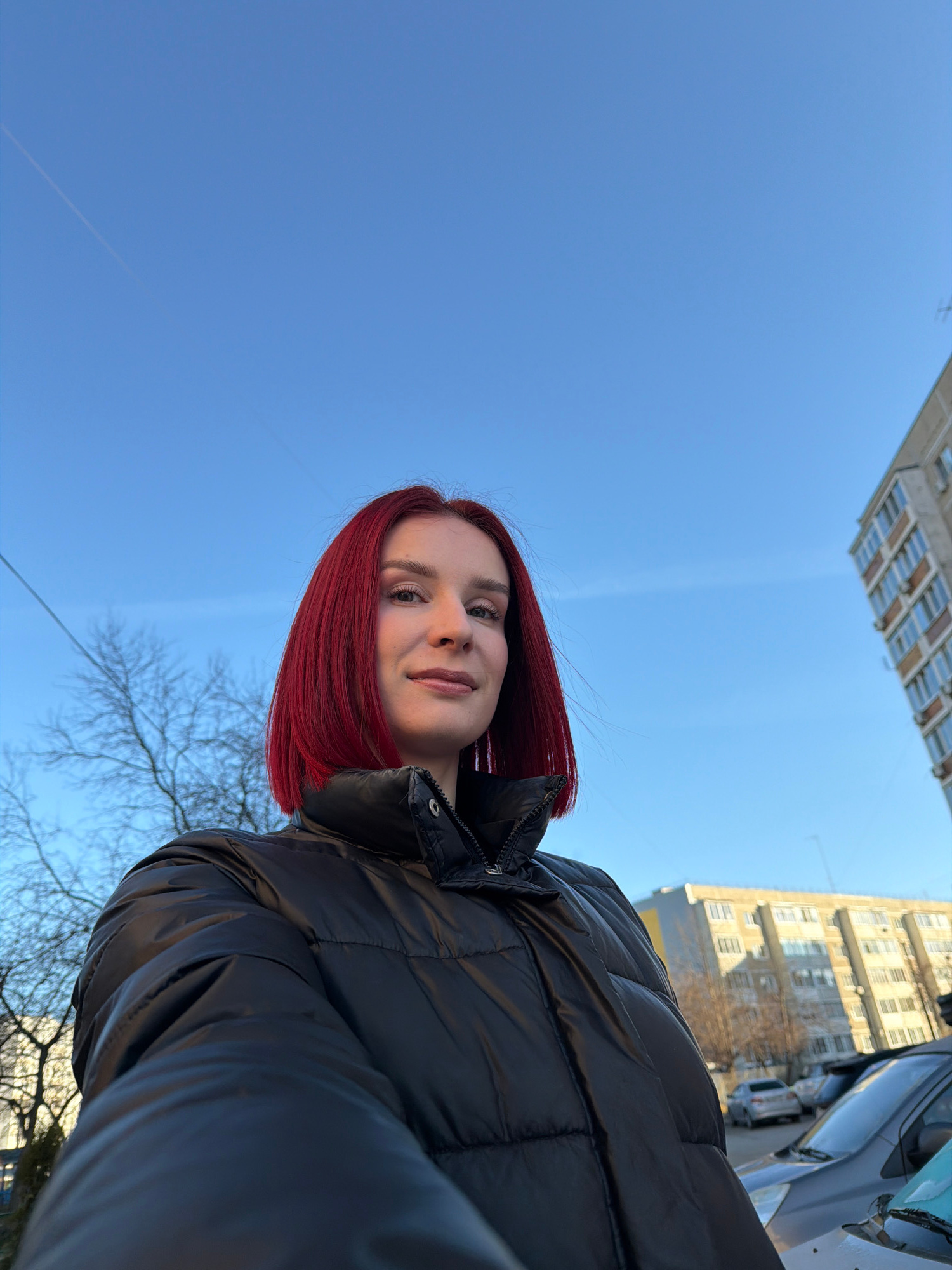 A woman with short, red hair is standing outside in Chaikovsky, Russia, taking a selfie. She is wearing a black puffer jacket and facing the camera with a slight smile. Behind her is a clear blue sky,…read more