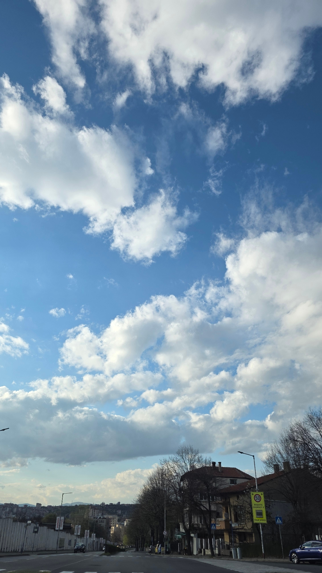 The image shows a street scene in Blagoevgrad, Bulgaria, under a cloudy blue sky. The view is oriented with the sky predominantly visible. On the right side, a street with buildings and trees lines th…read more