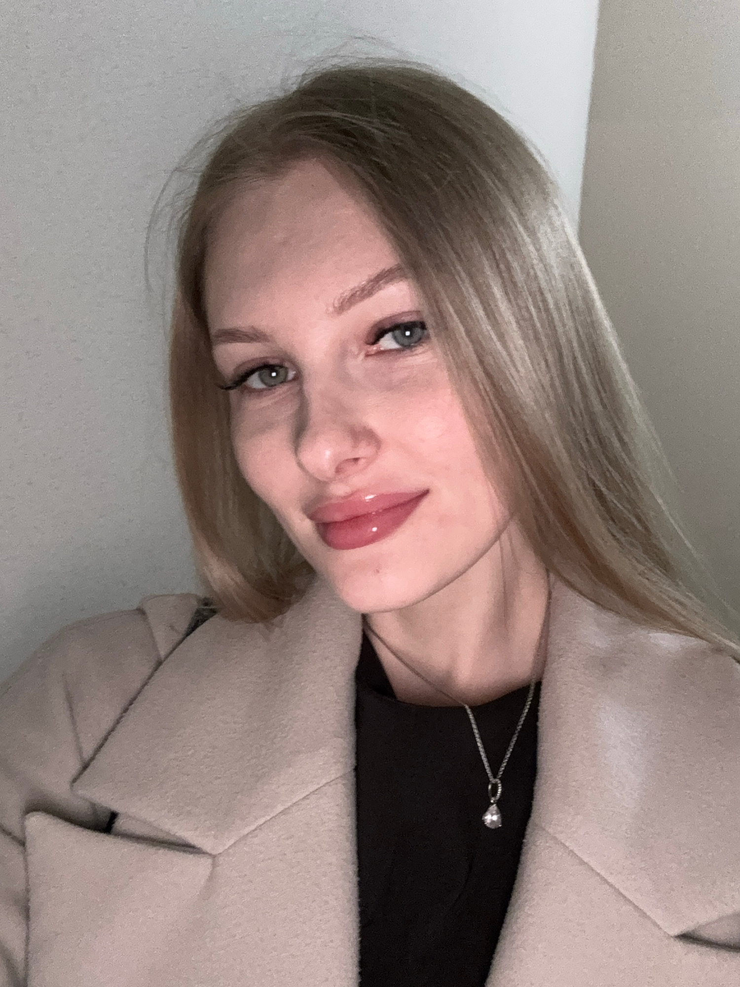 A young woman with light blonde hair and pale skin poses for a close-up, indoor portrait. Her eyes are light-colored and she has subtle makeup. She is wearing a black top underneath a light beige jack…read more