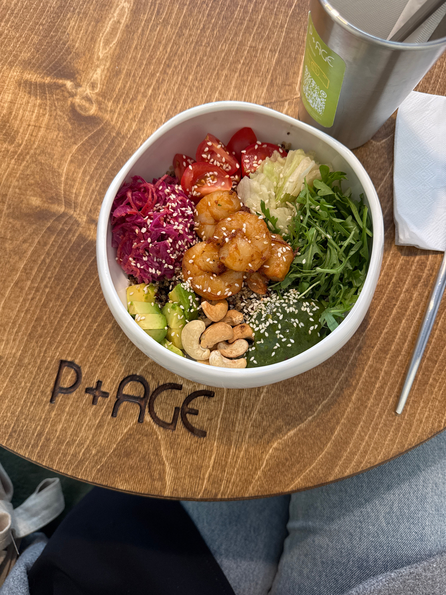 A top-down shot captures a colorful salad bowl, a beverage container, a napkin, and utensils on a wood-grained surface, seemingly a table. A person in denim jeans is seated at the table. The salad bo…read more