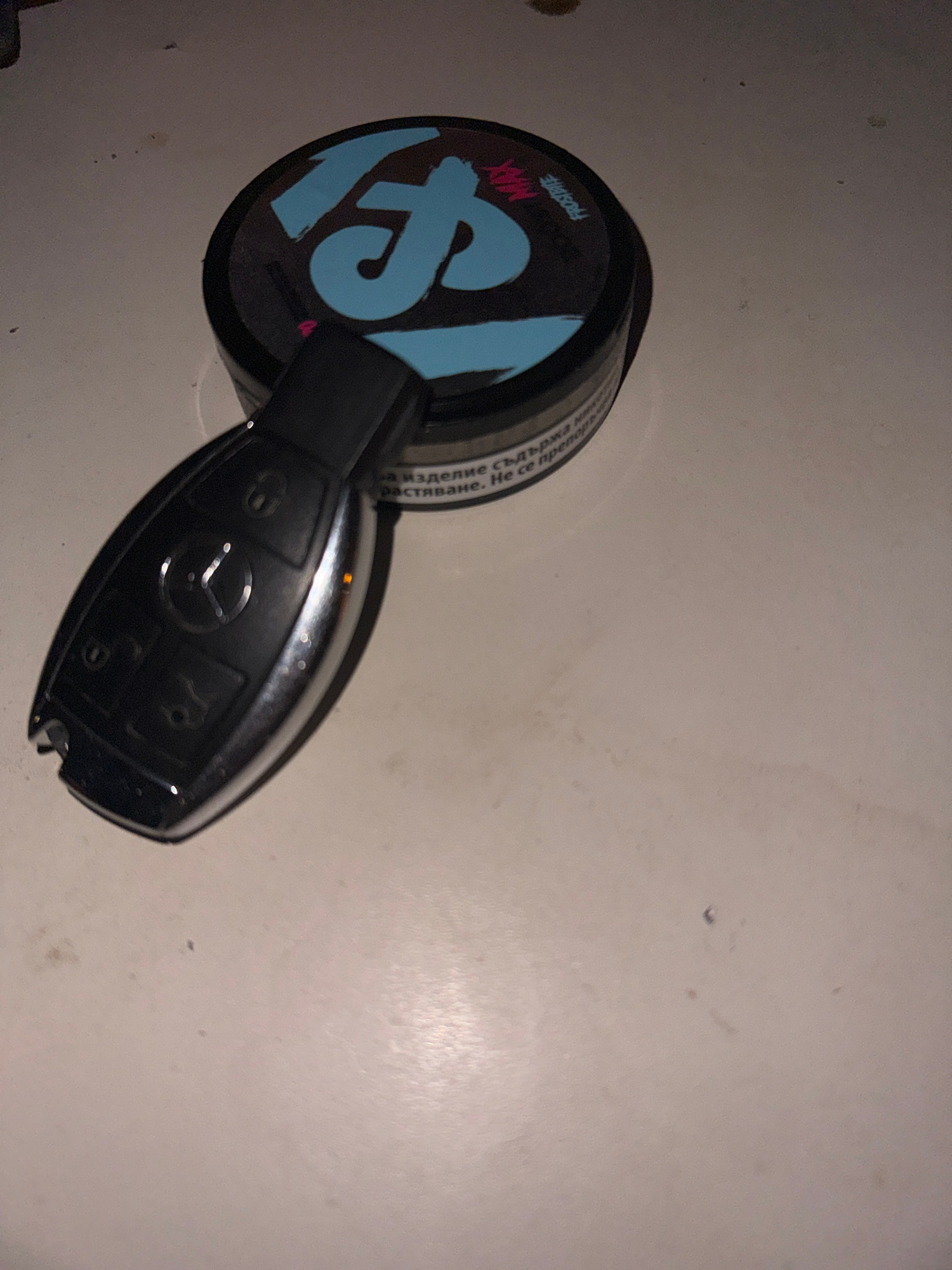 A black Mercedes-Benz car key rests on top of a round, black container with blue and white lettering. The background is a plain, light-colored surface. The scene provides no information to determine a…read more
