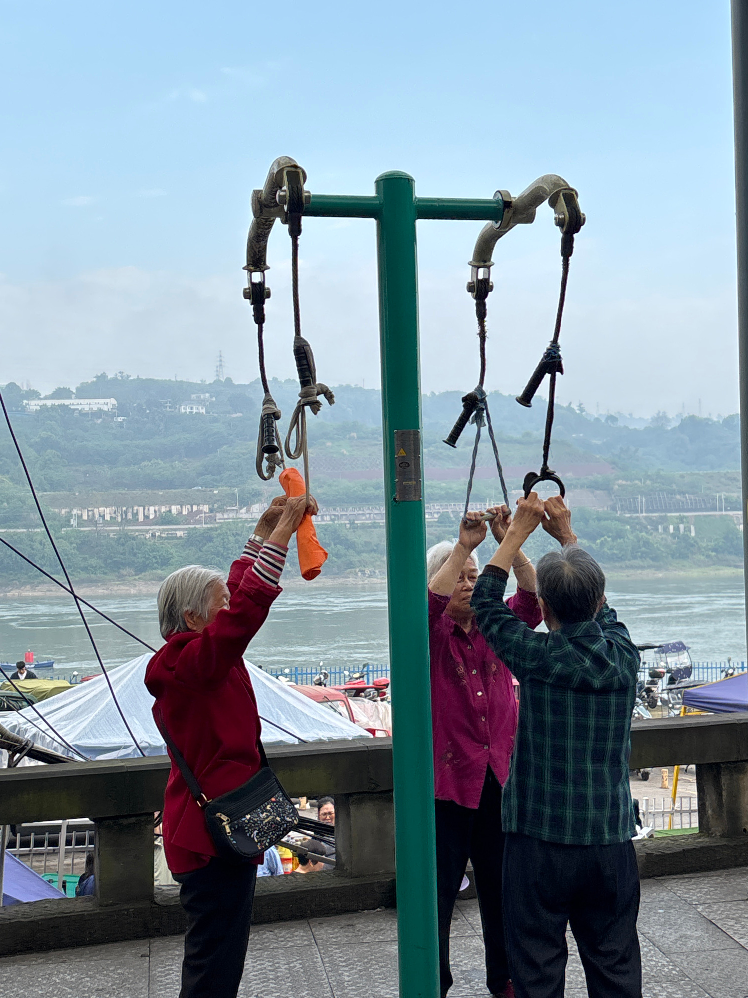 Three individuals are exercising outdoors in Jiangjin, China. They are utilizing a green metal frame with suspended hand grips, pulling on the grips as a form of exercise. The background reveals a riv…read more