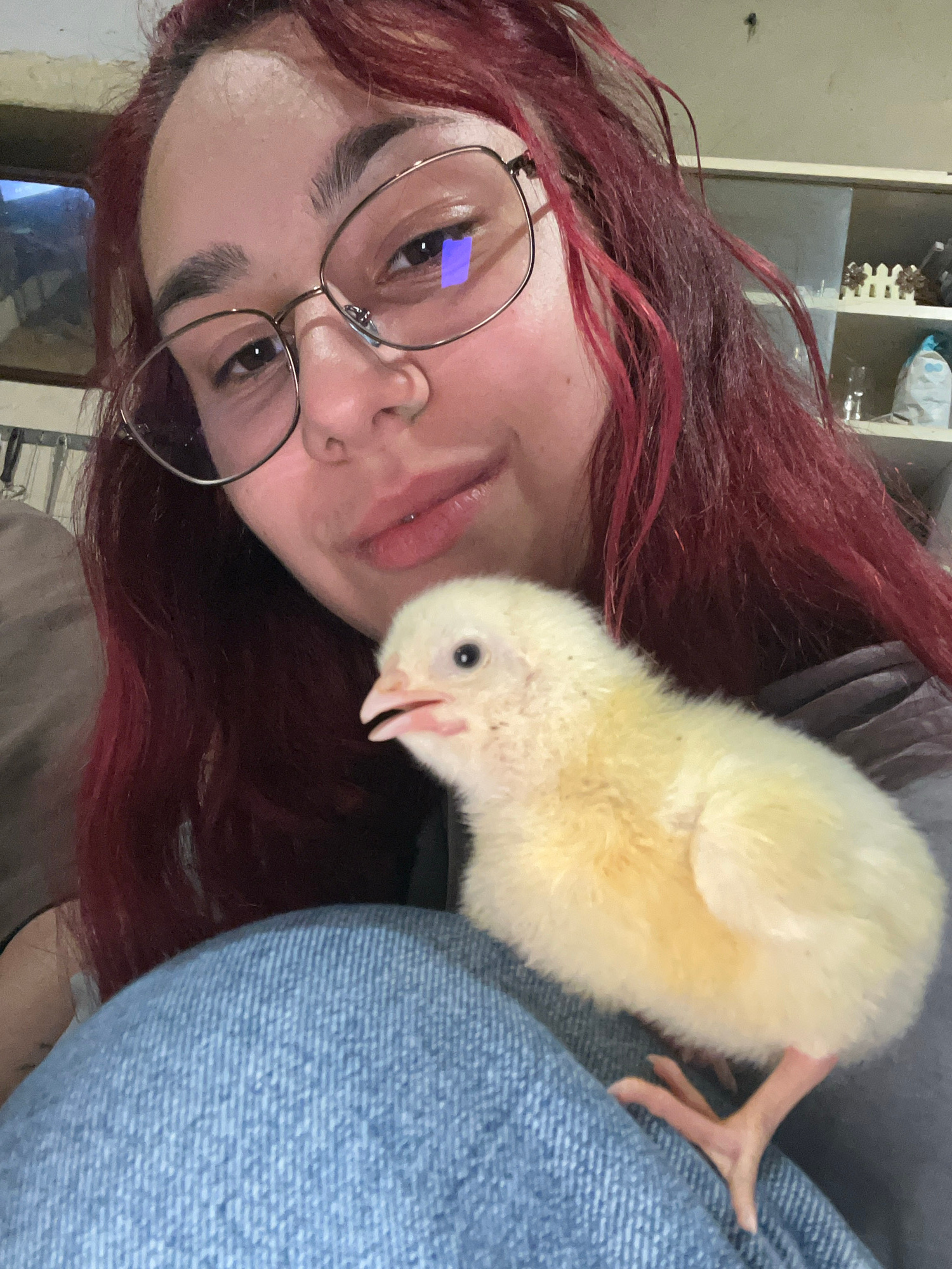 A woman with red hair and glasses is holding a yellow chick. The chick is perched on her blue jeans-clad leg. The background is a room with a shelf unit containing various objects. The location in the…read more