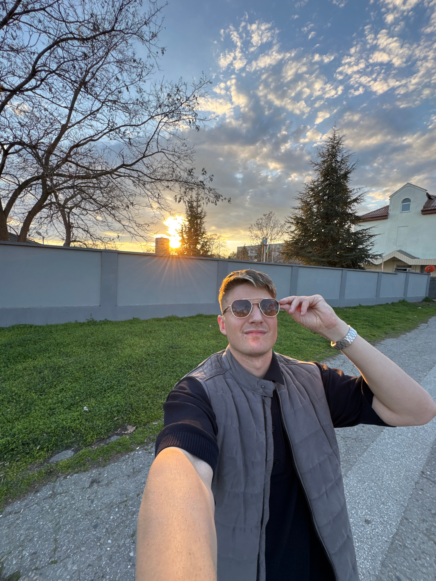 A man takes a selfie at sunset. He is wearing sunglasses, a black shirt, and a grey quilted vest. He is standing on a paved path next to a grassy area. A grey fence runs behind him, with trees and a building beyond. The sun is setting behind the fence, creating a bright glare. The sky is filled with clouds. I cannot confirm that this image was taken in Plovdiv, Bulgaria. | Open Wire