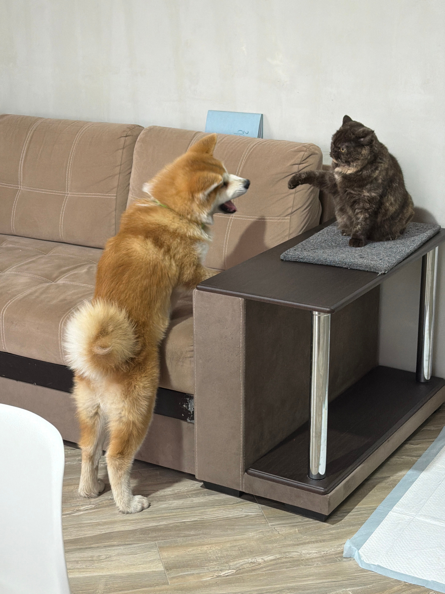 A brown tabby cat is perched on the edge of a brown cat house on a brown sofa, while a tan Shiba Inu dog is stretched out on the sofa below, with its head near the back of the sofa and its tail near a…read more