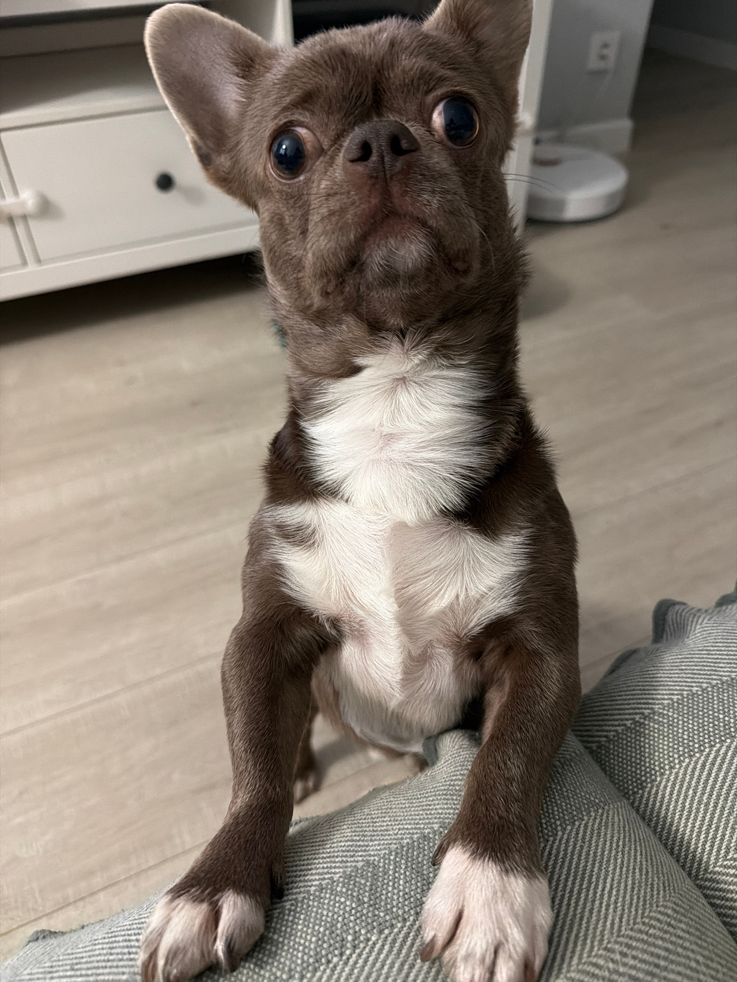 A brown and white chihuahua lies on a gray, patterned upholstered surface, with its front paws resting on the edge. The dog's head is facing the viewer, its eyes wide. Adjacent to the dog is a light-c…read more