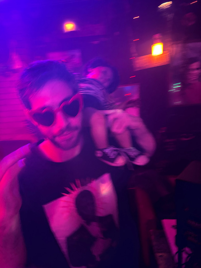 The blurred image displays two people, one wearing heart-shaped sunglasses, possibly holding a cigarette. A second person is behind them, wearing a hat and striped shirt. In the background, there are…read more