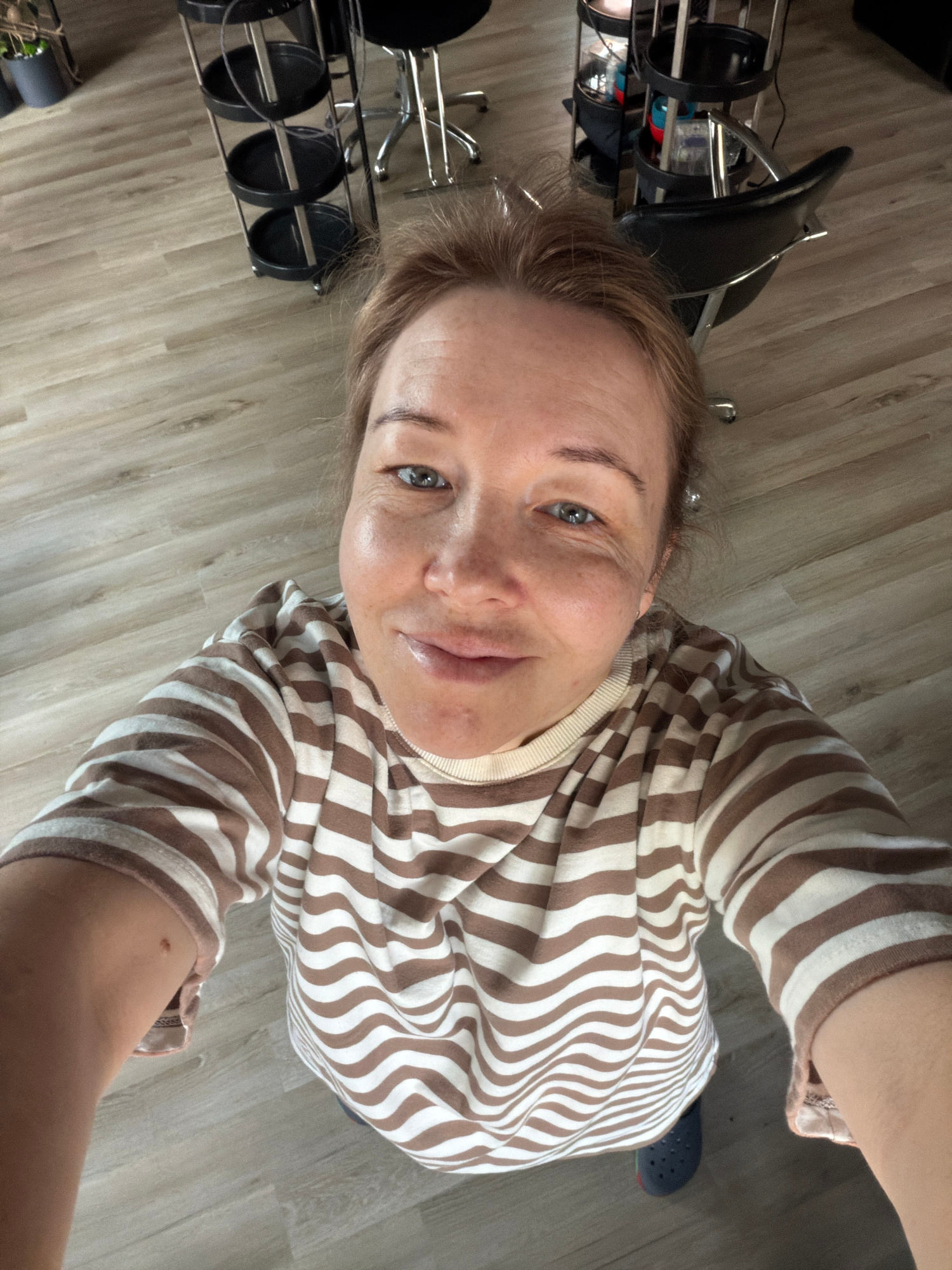 A woman with fair skin and light brown hair is taking a selfie from a high angle. She is wearing a brown and white striped long-sleeved shirt. A portion of a blue Croc shoe is visible near her. Behind…read more