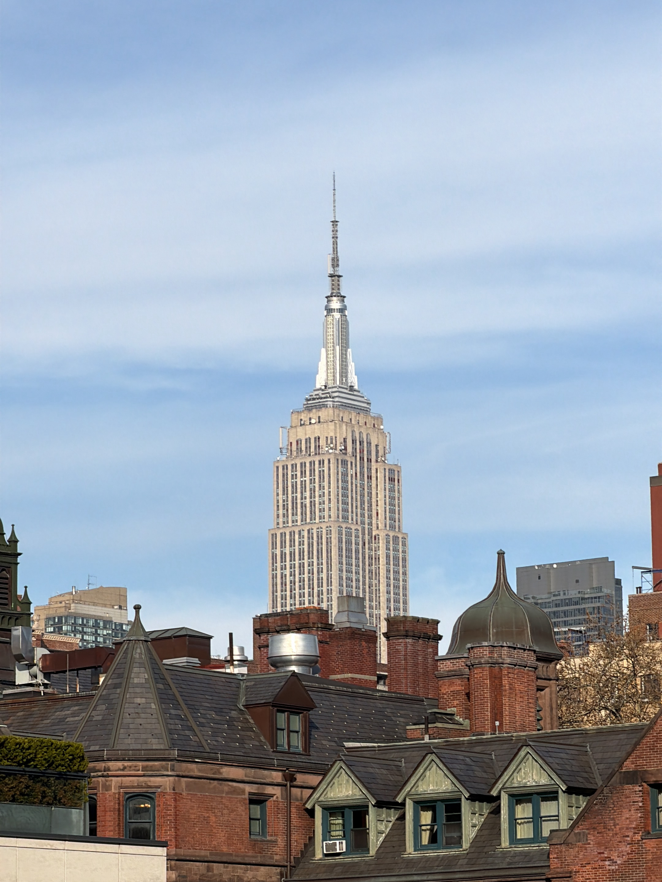The image depicts the Empire State Building in New York City, United States, as viewed from behind a series of brownstone rooftops. The building is centrally framed, rising above the brownstones and s…read more
